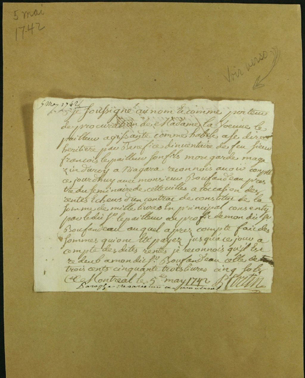 - Procès entre Jean Bouffandeau, prêtre du séminaire de St-Sulpice, demandeur, contre les seigneurs de l'Île de Montréal, les religieuses hospitalières de Montréal, Marie-Françoise de Couagne, et Pierre Trottier Desaulniers, négociant à Québec, défendeurs, tous créanciers de la succession de François Lepailleur