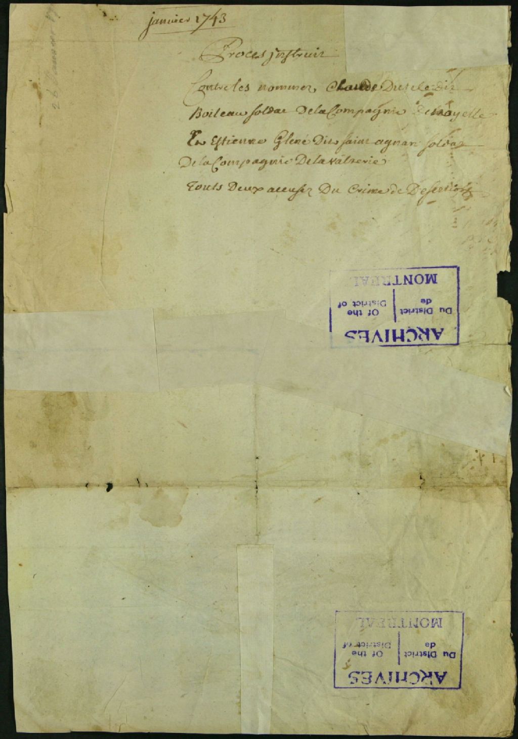 - Procès devant le Conseil de guerre contre Claude Dutel dit Boileau, soldat de la Compagnie de Noyelles, et Gliné dit Saint-Aignan, soldat de la Compagnie Lavaltrie, accusés de désertion