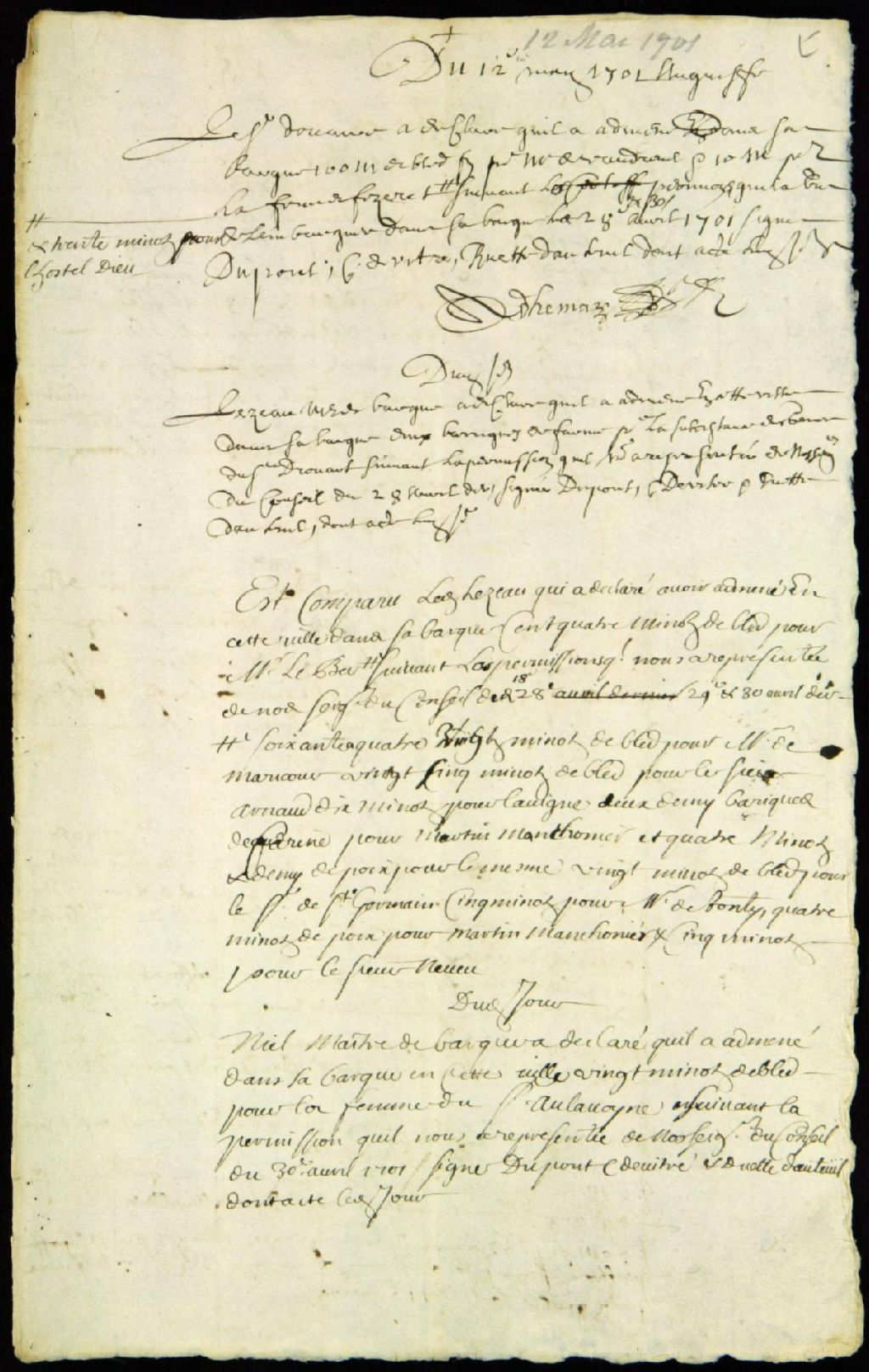 - Ce dossier d'administration civile est composé des déclarations du blé apporté en cette ville par les maîtres de barques Augustin Douaire, François-Marie Bouat, [Rancourt?], Niel et Lezeau, du 12 mai au 14 juin 1701
