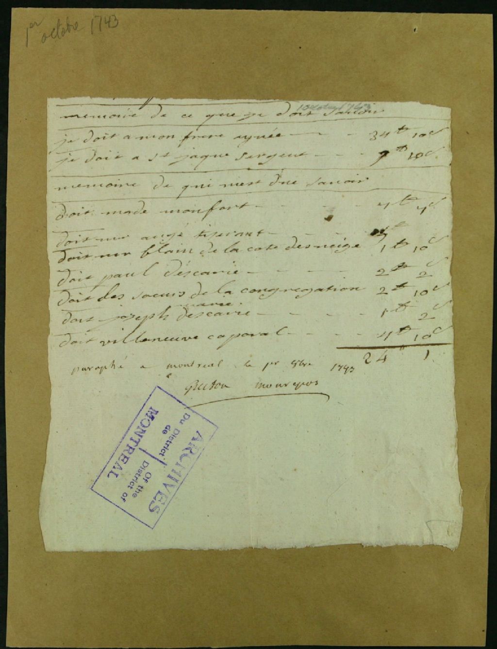 Mémoire de dettes et de recettes dues au Sergent Saint-Jacques par Joseph et Marie Descaries, le caporal Villeneuve, les soeurs de la Congrégation, et Blain, habitant de Côte-des-neiges, 1 octobre 1743, Archives nationales à Montréal, Fonds Juridiction royale de Montréal, (06M,TL4,S1,D4990).