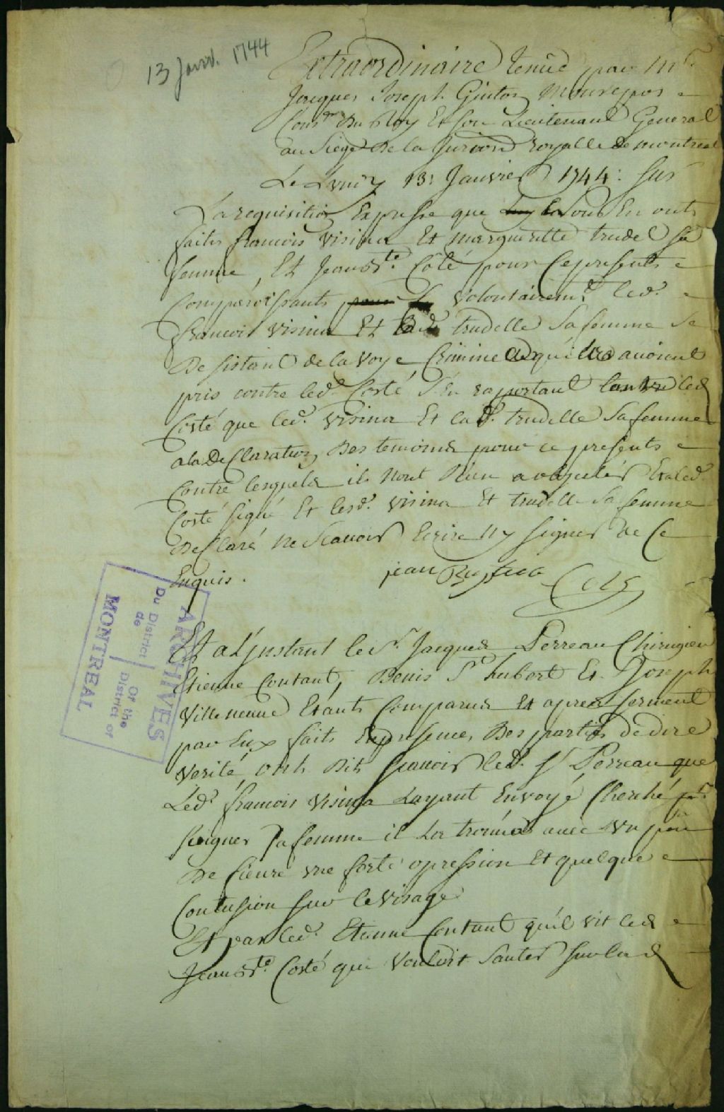 - Ce dossier de matière criminelle contient la sentence d'un procès criminel pour voies de fait, converti en poursuite au civil, à la requête de François Vézina et son épouse Marguerite Trudel contre Jean-Baptiste Côté condamné à payer 24 livres en dommages, plus les dépens. Les documents mentionnent les témoins suivants : Jacques Perrault, chirurgien, Étienne Content, [Denis Hubert dit St-Hubert?] et Joseph Villeneuve