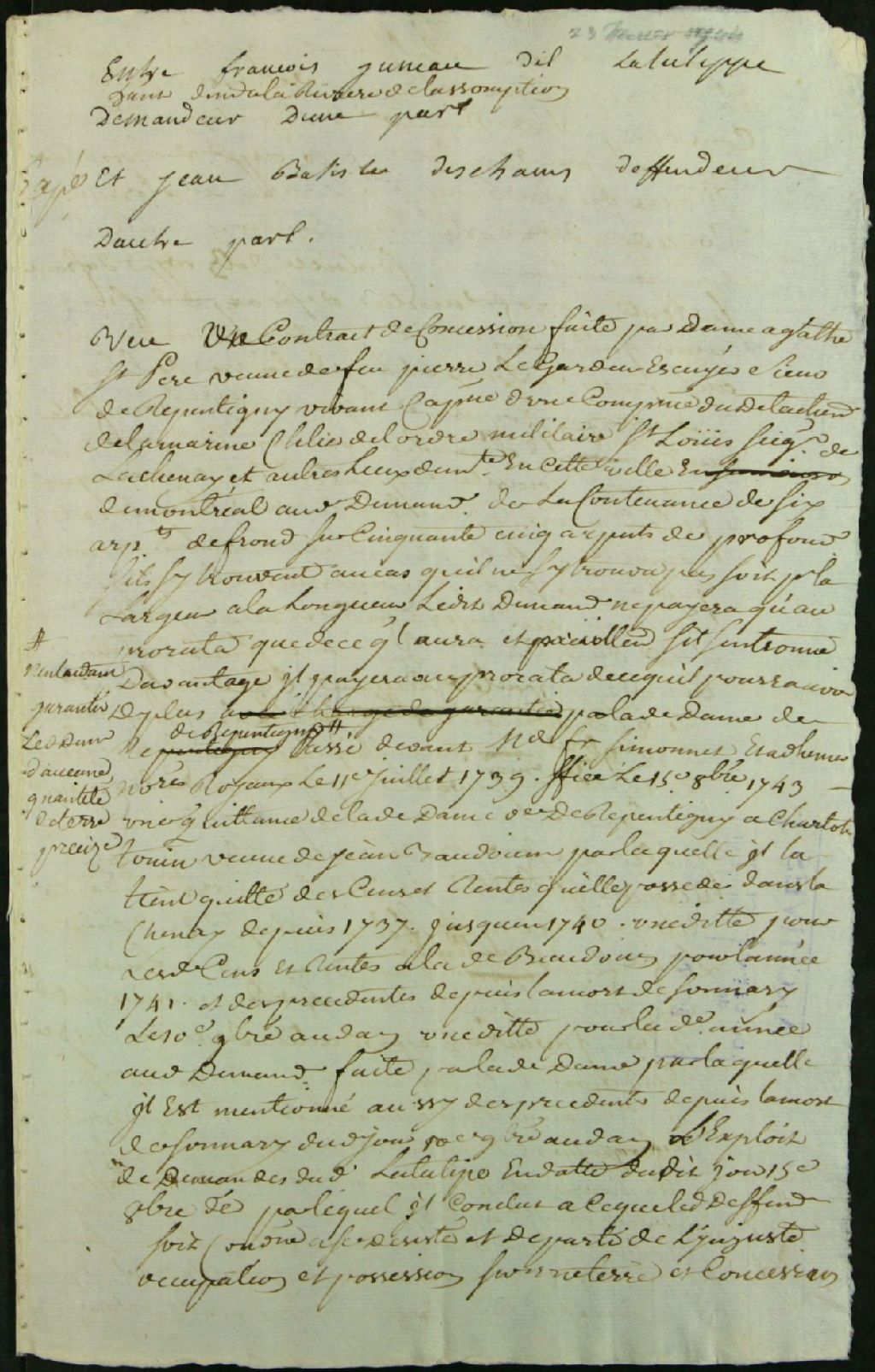- Procès entre François Jouineau dit Latulippe, habitant de Rivière l'Assomption, demandeur, et [Jean-Baptiste Hunault dit Deschamps?], défendeur, pour la restitution d'une concession