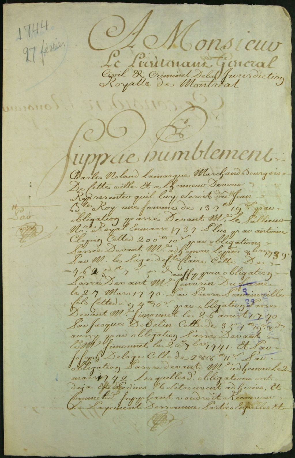 - Ce dossier d'administration judiciaire contient l'autorisation accordée à Lamarque pour avoir une seconde " expédition " de plusieurs obligations notariées en sa faveur : Jean-Baptiste Roy, notaire Lepailleur, mars 1737 ; Antoine Clopin, notaire Adhémar, octobre 1739 ; Lepage de Sainte-Claire, notaire Janvrin Dufresne, 27 mars 1740 ; Pierre Brault fils dit Pomainville, notaire Simonnet, 20 septembre 1741; Joseph Poirier dit Desloges [Deloge?], notaire Adhémar, 2 mars 1742 ; et Jacques Daudelin, notaire Simonnet , 20 septembre 1741. La signification et l'assignation servie à Antoine Clopin et Joseph Poirier dit Desloges [Deloge?], de se trouver à l'étude Adhémar "pour voir tirer une seconde expédition" complètent le dossier