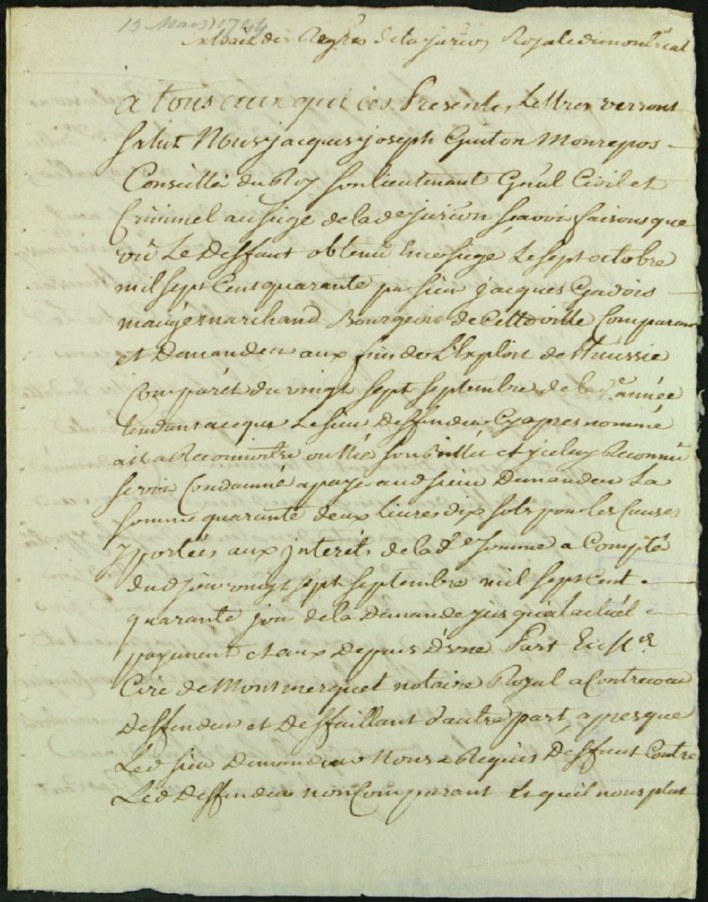 - Ce dossier de matière civile contient la sentence qui condamne Cyr de Monmerqué à payer à Jacques Gadois la somme de 42 livres et 10 sols vu son défaut à comparaître suite aux assignations à cet effet