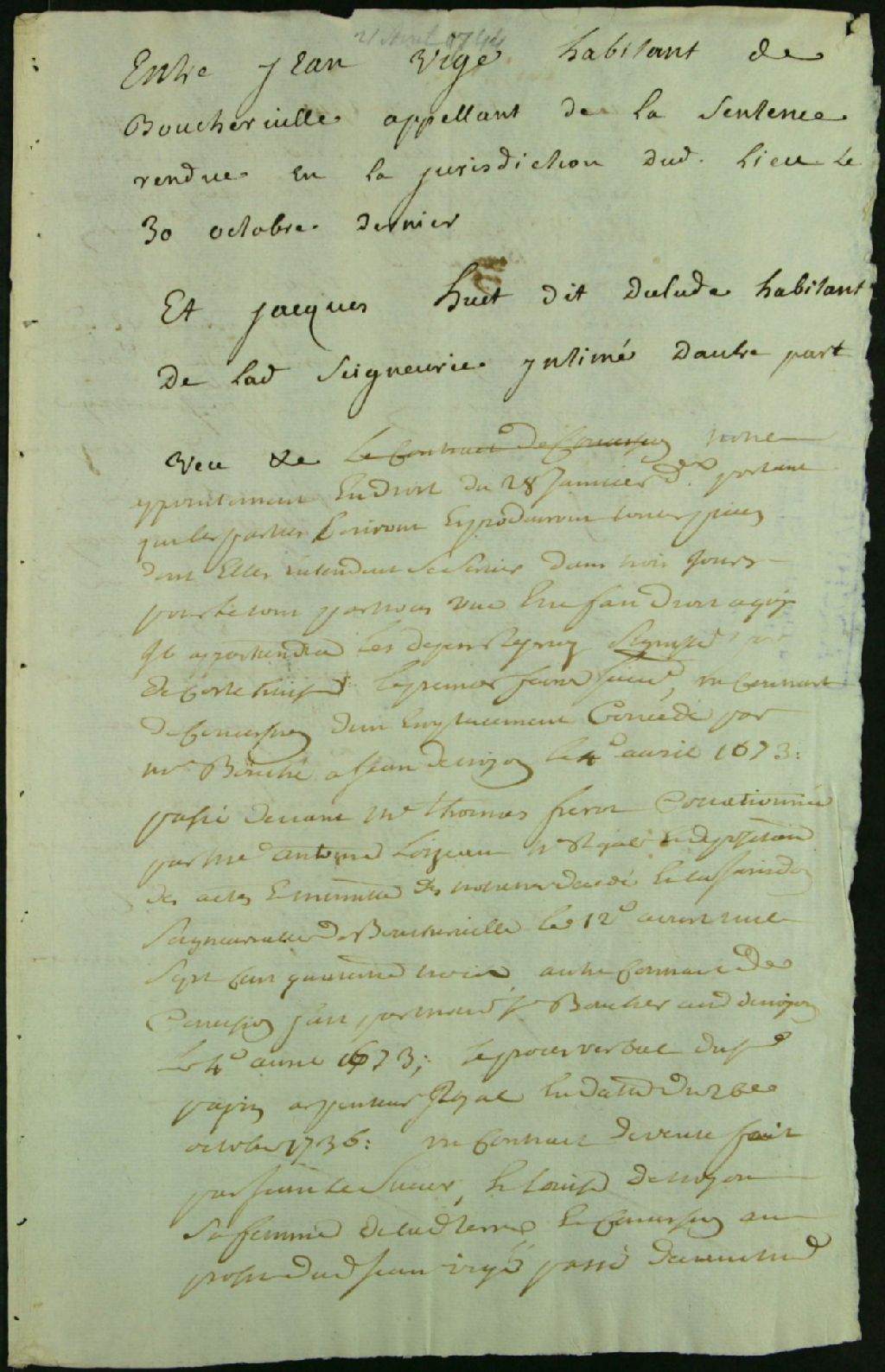 - Procès en appel de la Juridiction de Boucherville entre Jean Viger, requérant, et Jacques Huet dit Dulude, intimé, relativement à des « emplacements de terre »