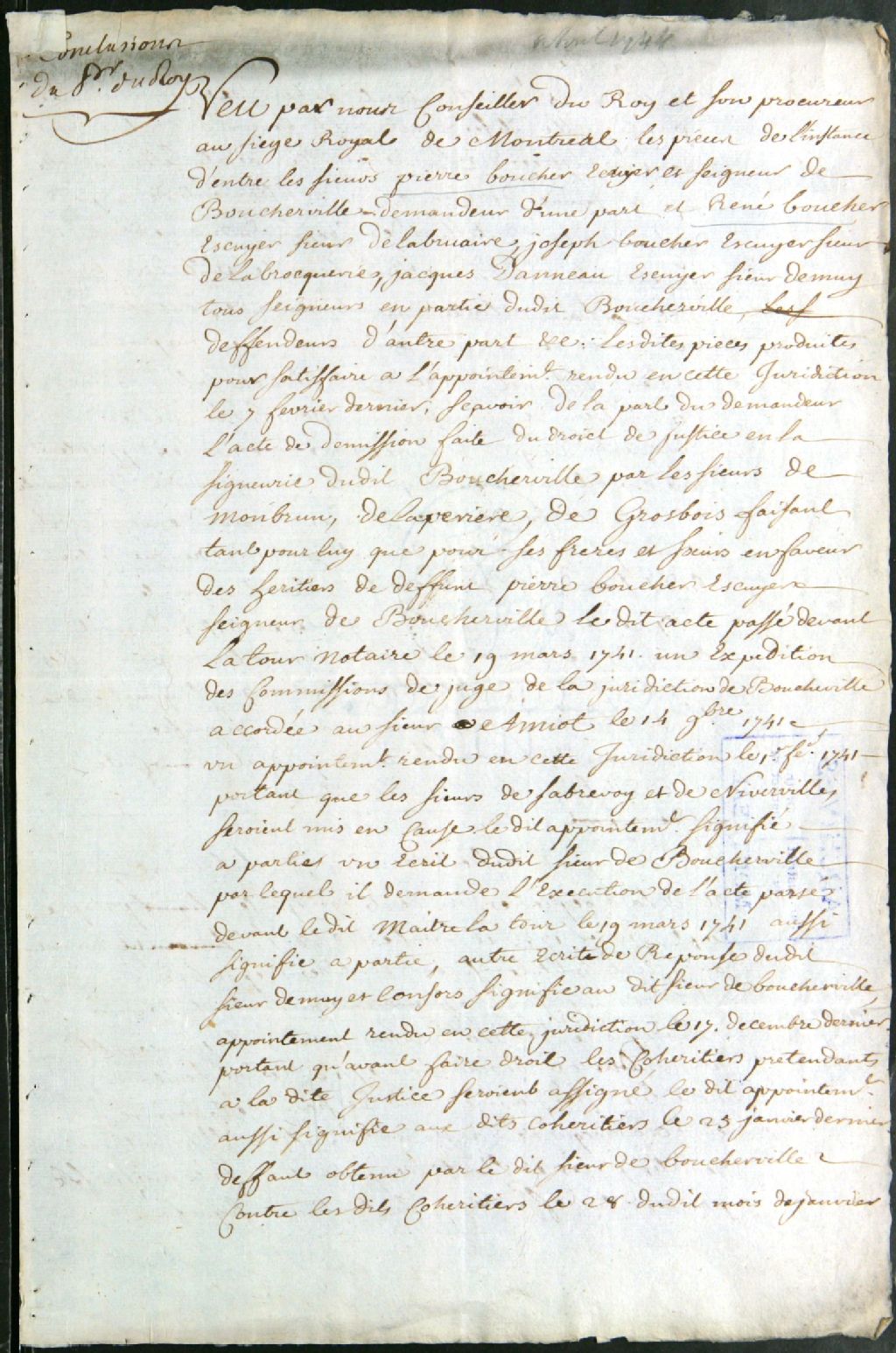 - Procès entre Pierre Boucher, seigneur de Boucherville, demandeur, et René Boucher de LaBruère et Joseph Boucher de LaBroquerie, coseigneurs, et Jacques Daneau de Muy, seigneur d'une partie de Boucherville, défendeurs, pour le payement des appointements d'un juge seigneurial
