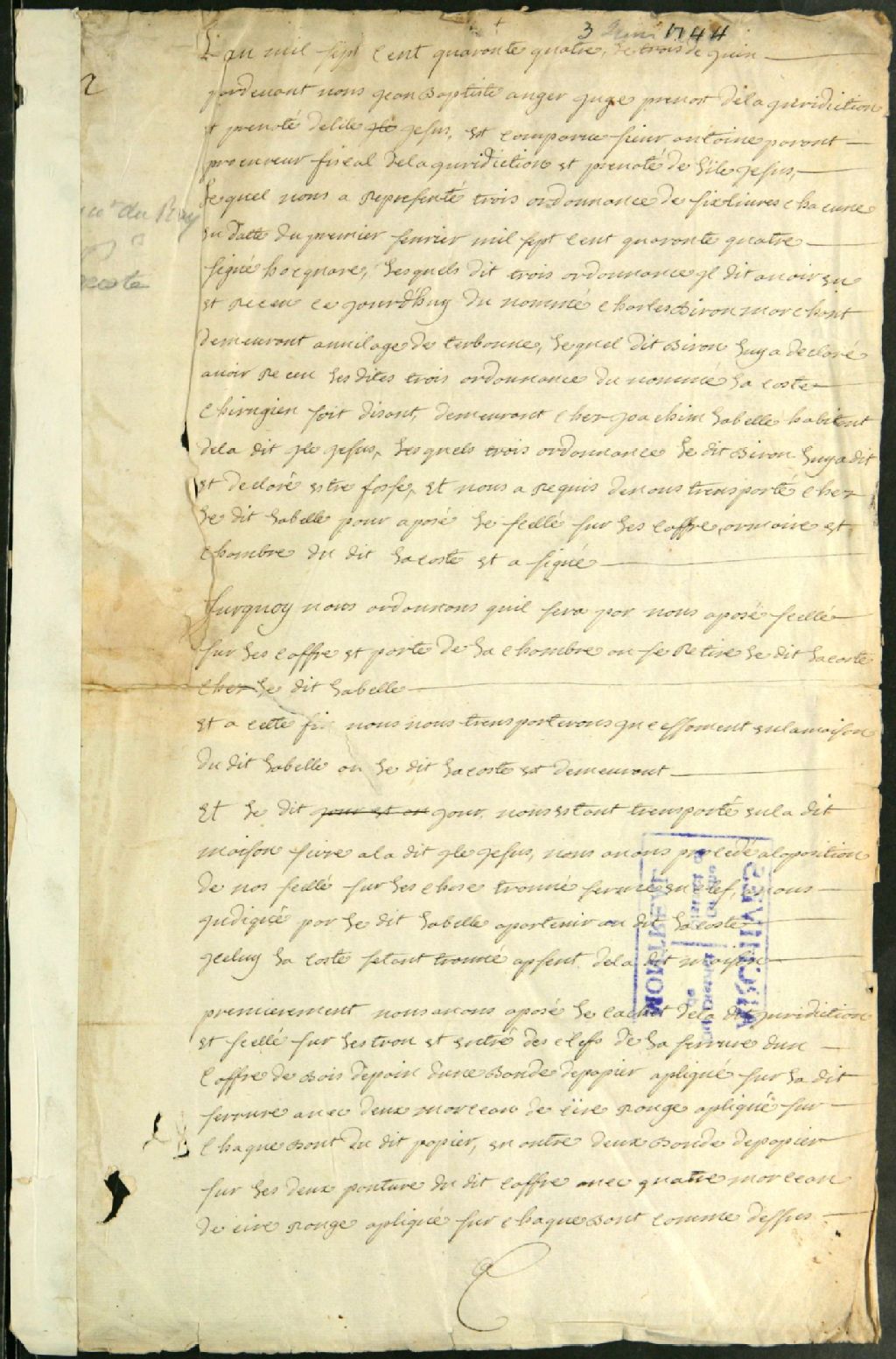 Ce dossier de matière criminelle est composé des pièces suivantes : la copie d'un procès-verbal d'apposition des scellés sur l'armoire et le coffre de Jean Lacoste, 23 ans, soi-disant chirurgien, demeurant chez Joachim Labelle, 52 ans, à l'île-Jésus, à la requête d¿Antoine Parent, procureur fiscal de ladite île, suite à une plainte formulée par Charles Biron, 47 ans, marchand du lieu, à l'effet que ledit Lacoste lui a payé des fournitures avec trois fausses ordonnances de la marine, d'une valeur de six livres chacune ; la requête pour l'arrestation de Jean Lacoste, présent en ville, et pour la tenue d'une information et la levée des scellés à son domicile ; la permission de faire informer avec ordre de se transporter à l'île-Jésus pour faire la levée des scellés ; l'ordonnance pour faire assigner les témoins du procureur du roi ; le procès-verbal de l'interrogatoire de Jean Lacoste, arrivé au pays par le vaisseau " L'heureux moine ", en [...]