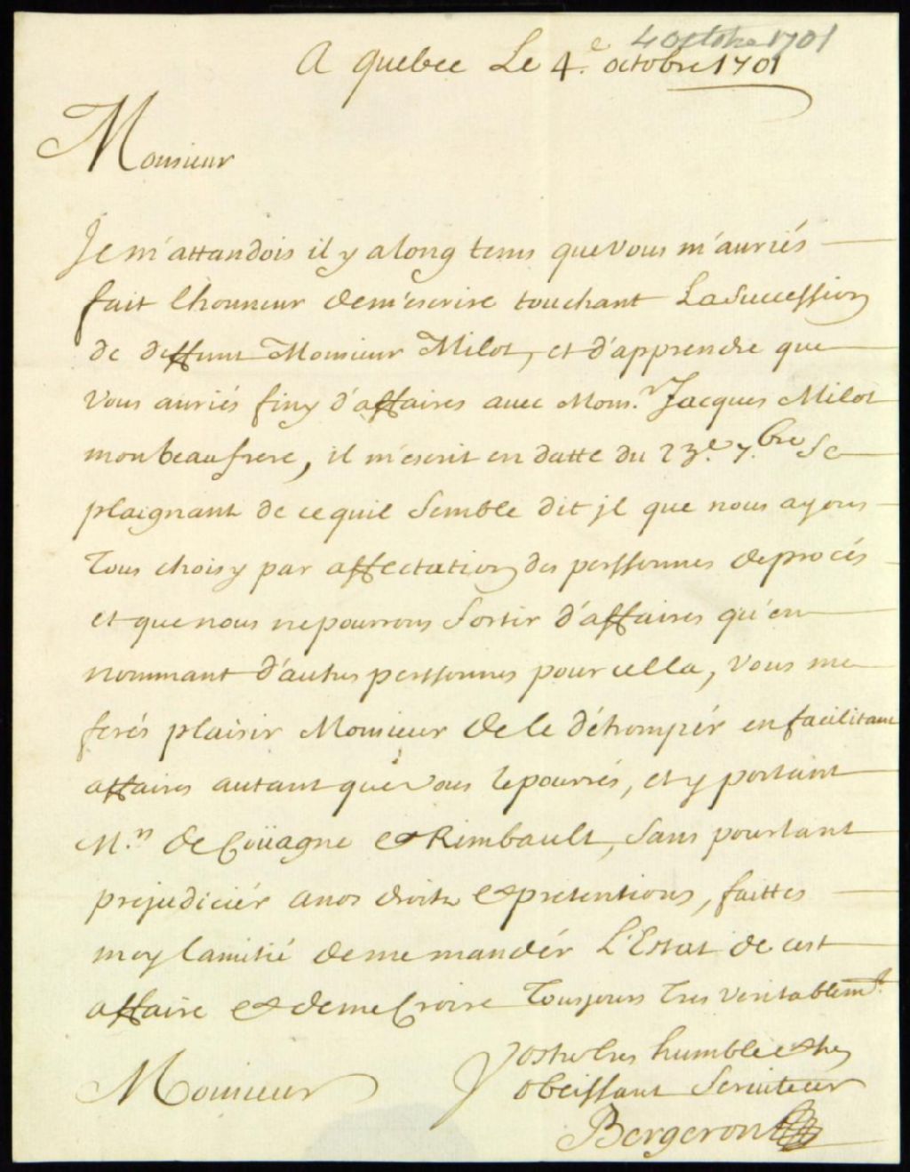 Lettre de Dominique Bergeron à Antoine Adhémar au sujet de la succession de Jean Milot, 4 octobre 1701, Archives nationales à Montréal, Fonds Juridiction royale de Montréal, (06M,TL4,S1,D520).