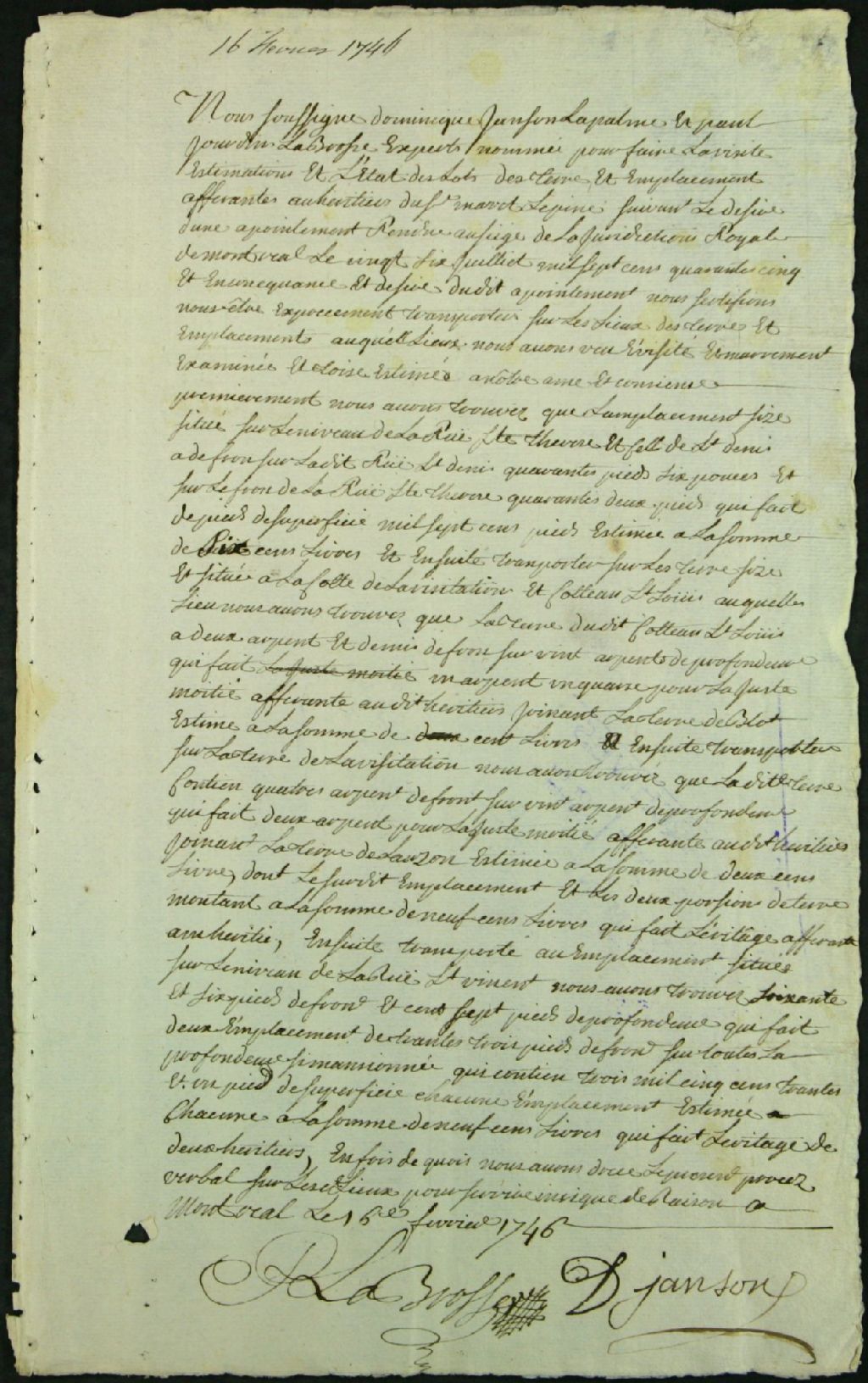 Expertise de lots de terres et d'emplacement appartenant aux héritiers de Maret dit Lépine, 15 février 1746, Archives nationales à Montréal, Fonds Juridiction royale de Montréal, (06M,TL4,S1,D5200).
