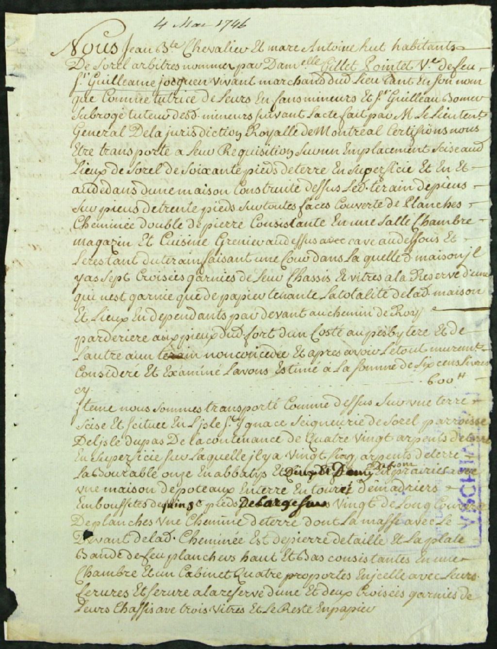- Licitation d'une maison à Sorel et d'une terre à l'île Saint-Jacques appartenant à la succession de feu Guillaume Joguin, marchand de Sorel, et Gillette Pointel
