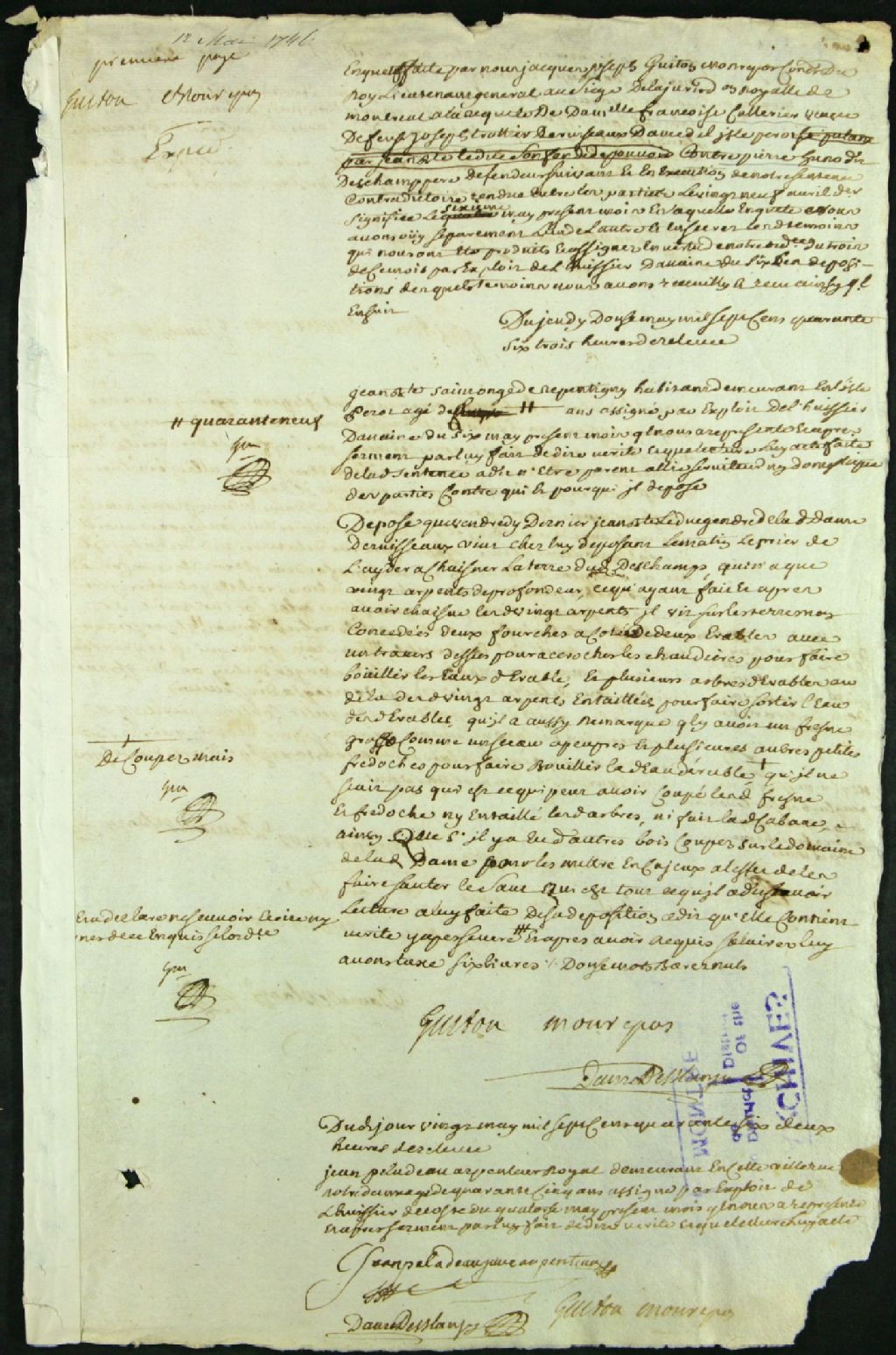 - Ce dossier de matière civile est composé des pièces suivantes : le procès-verbal d'enquête dans une poursuite intentée par Françoise Cuillerier contre Pierre Hunault dit Deschamps, père, pour lui payer un dédommagement pour avoir entaillé et recueilli la sève d'érables qui se trouvent sur son domaine ; et l'enquête de la poursuite. Les documents mentionnent les témoins suivant : Jean-Baptiste Saint-Onge, 49 ans, de l'île-Perrot ; Jean Péladeau, 45 ans, arpenteur royal ; et Jean-Baptiste Lalonde, 45 ans, de l'île-Perrot. Jean-Baptiste Leduc, gendre de Françoise Cuillerier, et Pierre Miville, procureur plaidant, sont cité dans cette affaire