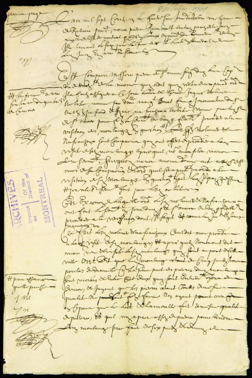- Ce dossier de matière civile est composé de la pièce suivante : le procès-verbal et le rapport d'experts dans une cause entre Pierre de Saint-Ours, seigneur et capitaine d'un détachement de la marine, contre Antoine Pascaud, concernant de l'équipement servant au fonctionnement d'un moulin à farine. Les experts étaient [Jaques Moulier?] et Isaac Nafrechou
