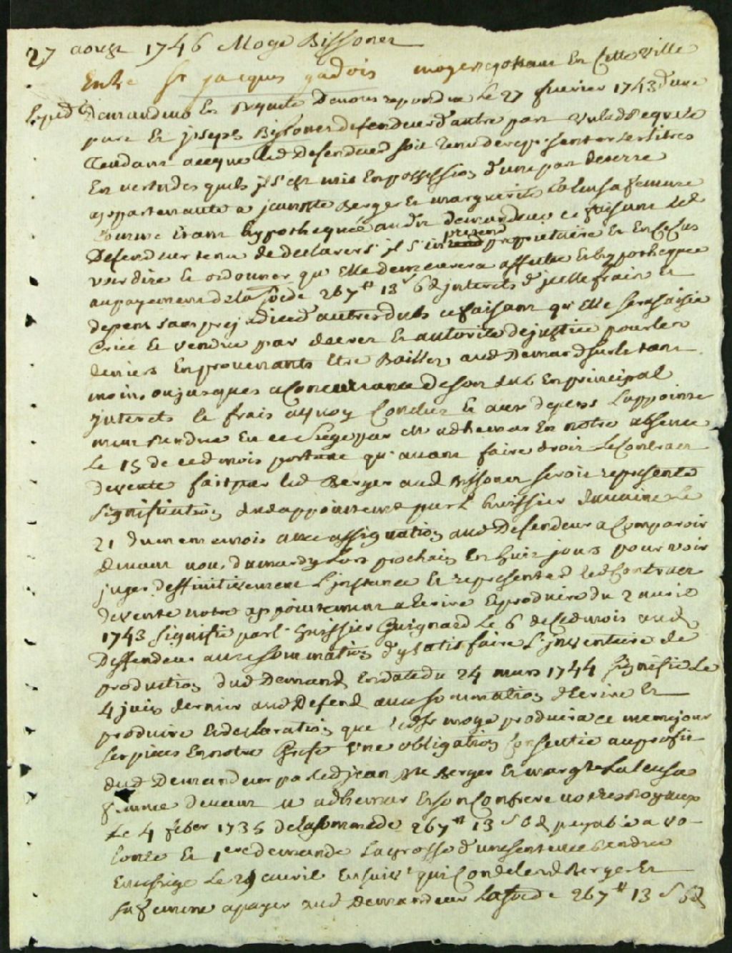 - Ce dossier de matière civile est composé de la sentence qui condamne Joseph Bissonnet à payer à Jacques Gadois dit Mauger, la somme de 267 livres et 13 sols ou à déguerpir de la terre de Jean-Baptiste Rougeau dit Berger et de son épouse Marguerite Lalue qu'il occupe, en vertu d'une hypothèque que Gadois détient sur ladite terre