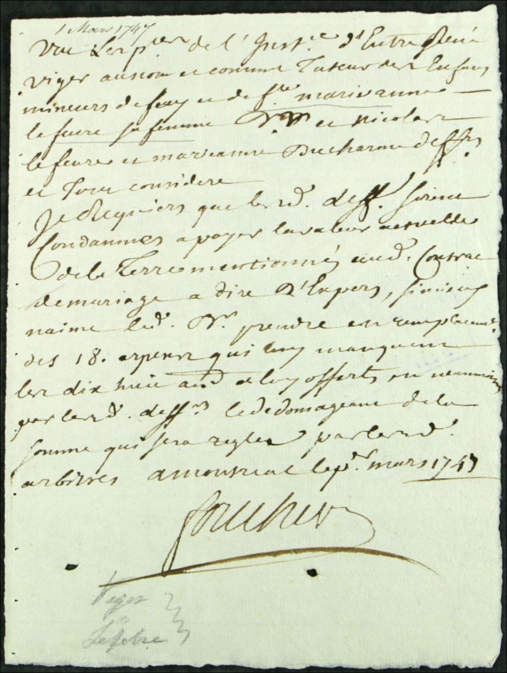 - Ce dossier de matière civile est composé des pièces suivantes : la conclusion du procureur du roi dans une poursuite intentée par René Viger, veuf de Marie-Anne Lefebvre, en sa qualité de tuteur de ses enfants mineurs, contre ses beaux-parents, Nicolas Lefebvre et Marie-Anne Ducharme, pour se faire livrer la terre mentionnée dans son contrat de mariage, avec les titres et leur faire défense d'y enlever du bois ; et le brouillon du jugement qui condamne les défendeurs à payer la valeur actuelle de la terre au demandeur suivant l'estimé qui en sera fait