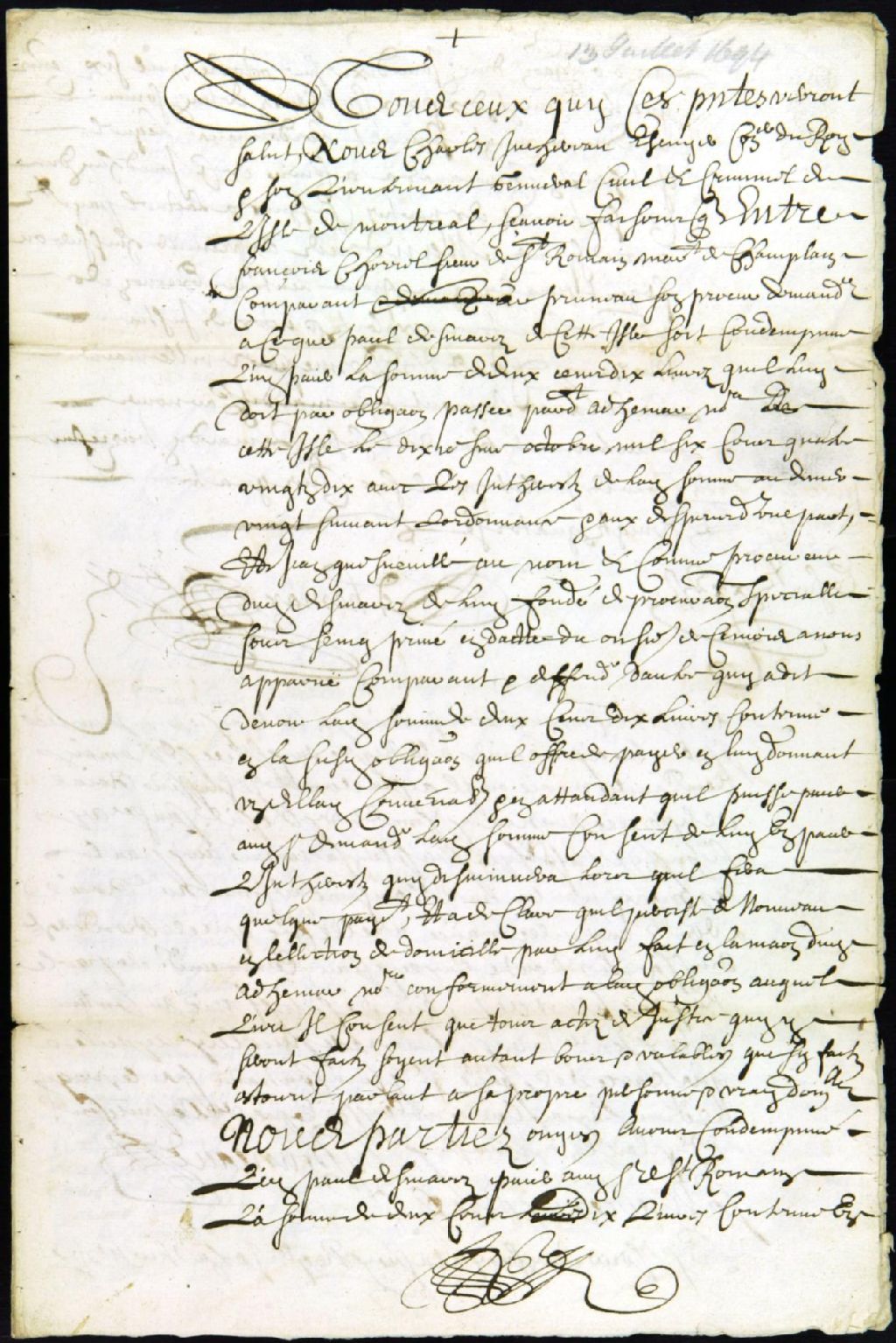 - Ce dossier de matière civile comprend la pièce suivante : la transcription par Adhémar, d'une sentence du 13 juillet 1694, par Juchereau, en faveur de François Chorel, contre Paul Desmarais, pour le payement d'une obligation de 210 livres passée par contrat devant le notaire Adhémar, le 10 octobre 1690; la signification et la demande d'exécution au sieur Desmarais, par Pruneau, huissier; et la signification, en plus de la demande d'exécution par le huissier Lory à Desmarais
