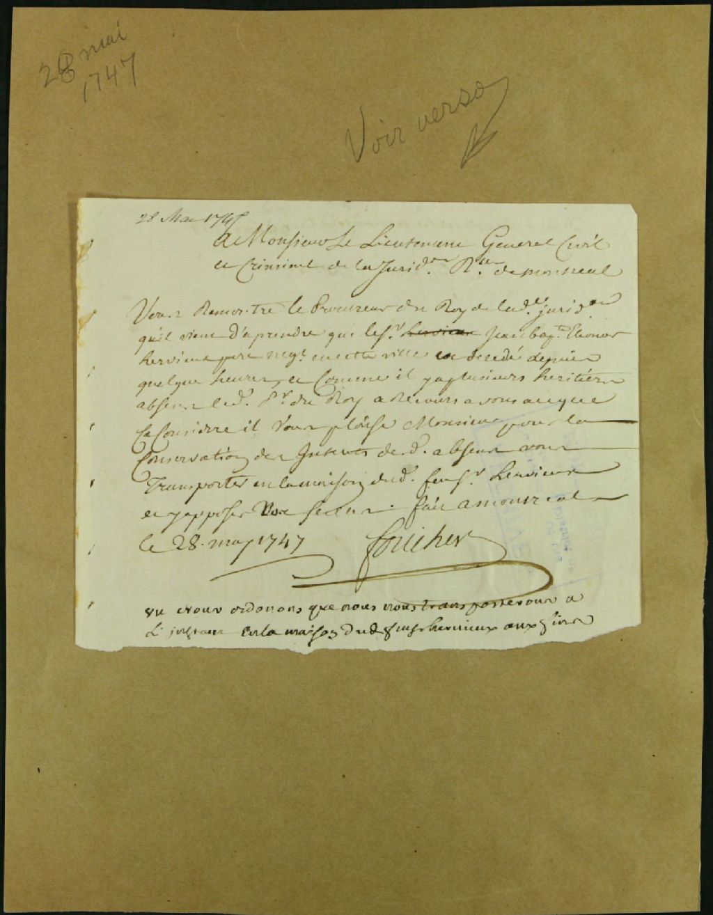 - Ce dossier d'administration judiciaire est composé des pièces suivantes : la requête adressée au lieutenant général pour lui demander de se rendre au domicile de Jean-Baptiste Léonard Hervieux, lequel vient de mourir, afin d'apposer les scellés sur son magasin puisque plusieurs héritiers sont absents ; l'ordonnance de se transporter sur les lieux afin de procéder à l'apposition des scellés ; le procès-verbal de ladite apposition aux divers endroits de la maison et du magasin, laissés à la garde de Jacques Hervieux, fils ; la description sommaire des biens et effets ; la requête des héritiers pour la levée des scellés ; l'ordonnance ; le procès-verbal pour ce faire ; et l'acte de notoriété par lequel un groupe de marchands de Montréal déclarent qu'au décès de Léonard Jean-Baptiste Hervieux, celui-ci n'avait fait aucun testament qui puisse changer le cours ordinaire des successions. Les déclarants sont alors les marchands Alexis Lemoine dit Monière, bourgeois ; Ignace Gamelin, bourgeois ; Louis Charly Saint-Ange, bourgeois ; Paul Guillet, bourgeois ; Pierre-Noël Courthiau ; et Pierre Guy. Les héritiers mentionnés dans les documents sont Pierre Jean-Baptiste et Louis Hervieux ; Toussaint Pothier, époux de Geneviève Hervieux ; Jean-Baptiste Lecomte Dupré, époux d'Anne Hervieux ; Luc de Lacorne de Chapt, époux d'Hervieux ; et François-Josué de Lacorne de Dubreuil, époux d'Hervieux
