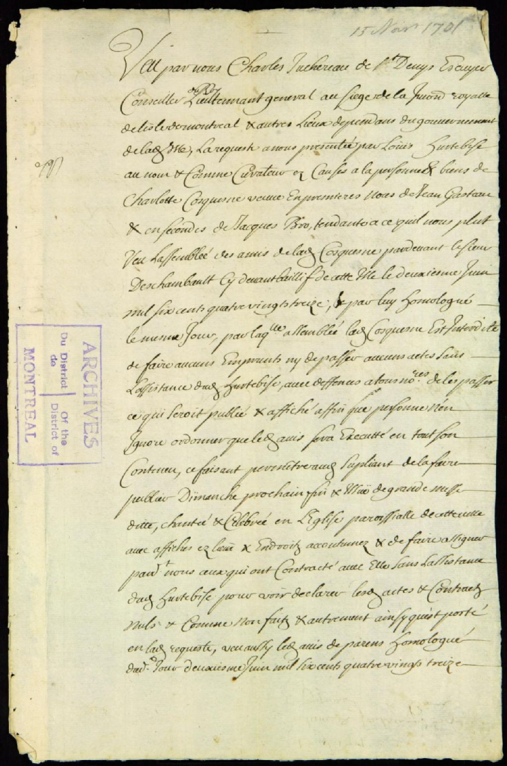 - Ce dossier d'administration judiciaire est composé des pièces suivantes : le dictum de sentence pour faire comparaître tous ceux qui ont contractés avec Charlotte Coppequesne, veuve de Jean Gateau et de Jacques Brault, sans l'intervention de Louis Hurtubise son curateur ; le procès-verbal d'une réunion de parents et d'amis en vue de faire interdire Charlotte Coppequesne ; l'accord du procureur du roi ; et l'homologation de la sentence d'interdiction