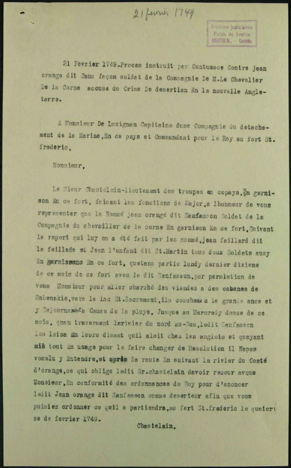- Ce dossier de matière criminelle est composé des pièces suivantes : la requête, avec demande de procès, adressée à Dazémar de Lusignan, commandant au Fort Saint-Frédéric, par François Chastelain, lieutenant et aide-major, à l'effet que Jean Orangé aurait déserté chez les Anglais alors qu'il était parti à la chasse ; les ordres de Lusignan d'envoyer le sergent Laroche et des soldats à la recherche du fugitif et à Jean-Baptiste de Saint-Laurent, enseigne, d'instruire le procès ; la requête de Chastelain pour la tenue d'une information ; le procès-verbal de l'information militaire parSaint-Laurent, rédigé par Jean-Jacques Blanc dit Laliberté, commis greffier pour la circonstance ; le récolement des témoignages ; le réquisitoire de Gaspard Adhémar de Lantagnac, major de la ville de Montréal, pour que l'accusé soit déclaré atteint du crime de désertion et condamné par contumace à être pendu et, faute d'exécuteur de la haute justice, à être passé par les armes ; le procès-verbal de la sentence de condamnation par le conseil de guerre sous la présidence de Charles Lemoine, baron de Longueuil ; et le rapport de la lecture de la sentence aux troupes.Les documents mentionnent les témoins suivant : Symphorien Turnié dit Nantois, caporel de la Compagnie de Lacorne, âgé de 48 ans ; Jean Lenfant dit Saint-Martin, soldat de la Compagnie de Lacorne, âgé de 28 ans ; et Jean Fayard dit Lafeuillade, soldat canonnier, âgé de 30 ans