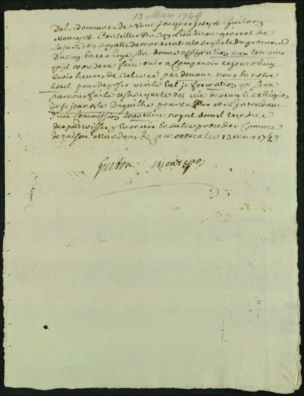 Sollicitation de Jean-Baptiste Daguilhe, fils, pour être reconnu comme notaire dans les côtes du nord de la Juridiction Royale de Montréal, 4 mars 1749 - 13 mars 1749, Archives nationales à Montréal, Fonds Juridiction royale de Montréal, (06M,TL4,S1,D5417).