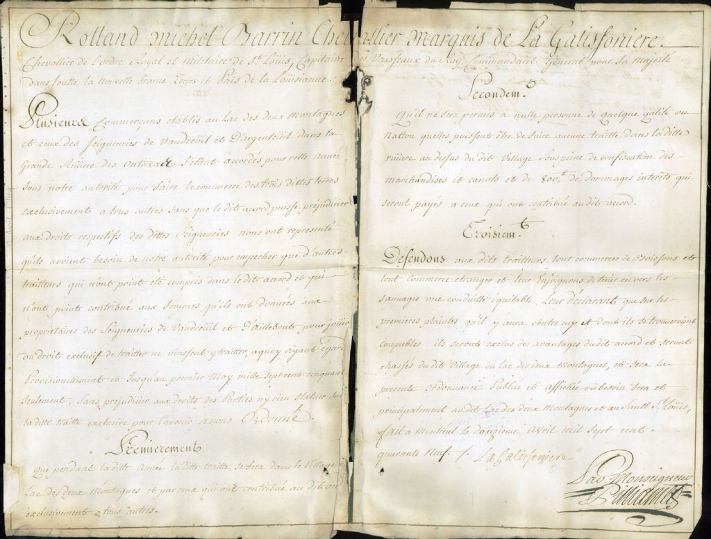 - Ce dossier d'administration civile est composé de la pièce suivante : l'ordonnance par Rolland-Michel Barrin de la Galissonière, commandant général de la Nouvelle France et de la Louisiane, au sujet du droit de traite exclusif par certains habitants établis au Lac-des-deux-Montagnes ; et le rapport de publication
