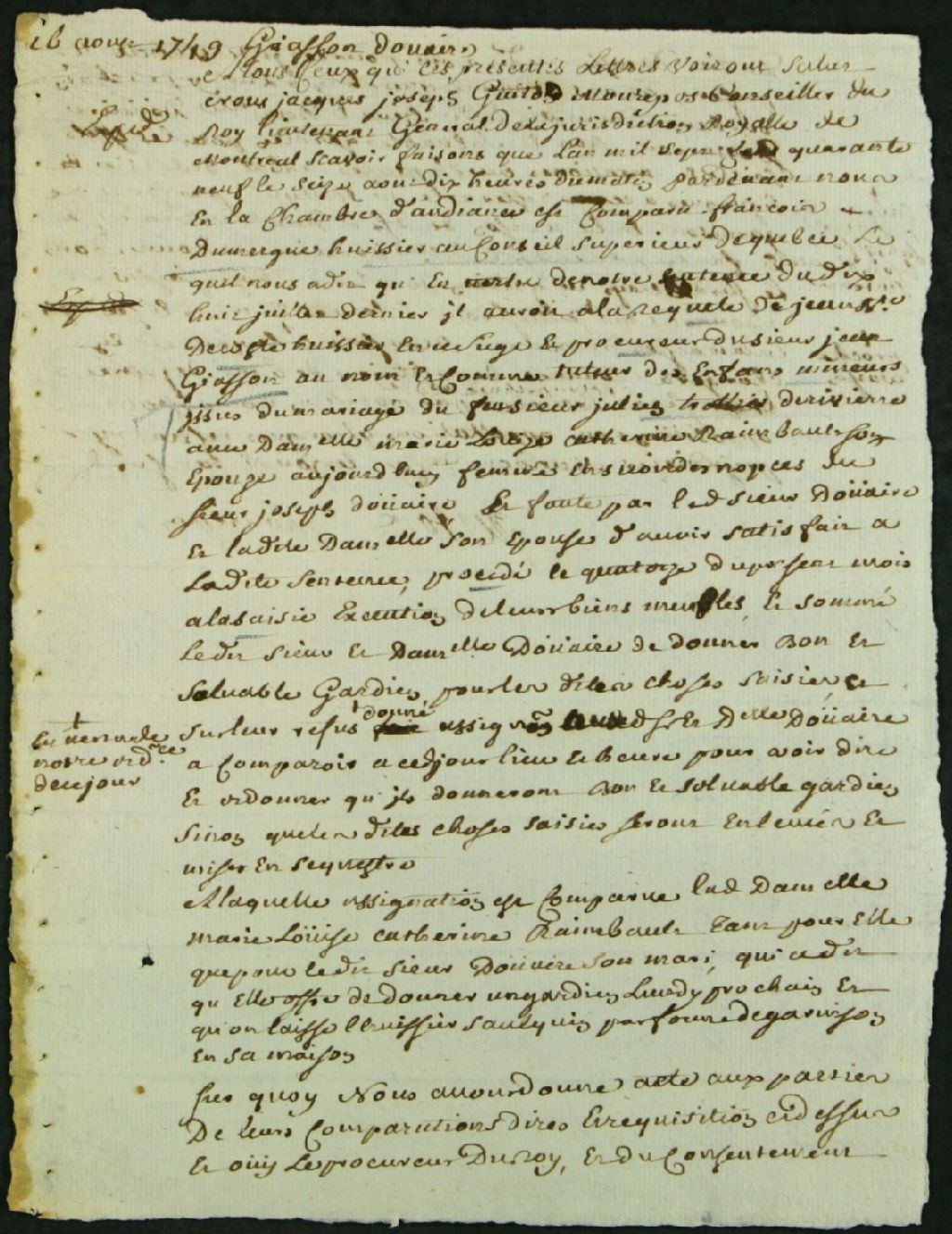 - Ce dossier de matière civile est composé des pièces suivantes : la transcription d'une sentence du registre d'audience qui permet à Marie-Catherine Raimbault, à la requête de Jean Chiasson, de reporter à lundi prochain la présentation d'un gardien de saisie solvable ; l'acte de procuration de Marie-Catherine Raimbault à François Dumergue, huissier, pour présenter en son nom le compte de tutelle de la succession de Julien Trottier et l'affirmer véritable ; le rapport d'évaluation des deux maisons de la succession Trottier, situées sur la rue Saint-Paul, et de la terre située à Saint-Laurent, par les experts Bourhis et Paul Tessier ; et le rapport d'enchère et de mise à prix des maisons et de la terre. G. Hodiesne est cité à titre de notaire et Malidor, écrivain, est cité à titre de signataire dans ces documents