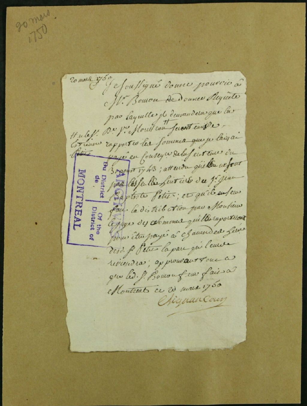 - Ce dossier de matière civile est composé des pièces suivantes : la procuration manuscrite par Louis Damours de Clignancourt au notaire Bouron pour que ce dernier entreprenne une poursuite contre Suzanne Petit et Étienne Petit de Boismorel, en tant qu'héritiers de Jean-Baptiste Petit de Boismorel et de sa femme, Marie Bailly, afin que les défendeurs rapportent la somme de 1799 livres, 12 sols et 9 deniers payée par le demandeur aux défendeurs relativement à une sentence du 30 août 1743, afin qu'elle fasse l'objet d'un nouveau partage judiciaire qui tiendrait compte que les défendeurs ne sont pas les seuls héritiers de la succession de Jean-Baptiste Petit de Boismorel et de Marie Bailly qui auraient eu droit à se partager ladite somme perçue ; la requête de Louis Damours de Clignacourt pour faire assigner les défendeurs à comparaître et restituer la somme en vue d'un partage judiciaire entre tous les héritiers de ladite succession ; l'ordre pour faire signifier la requête à partie et les faire assigner à comparaître ; et le rapport de signification et d'assignation