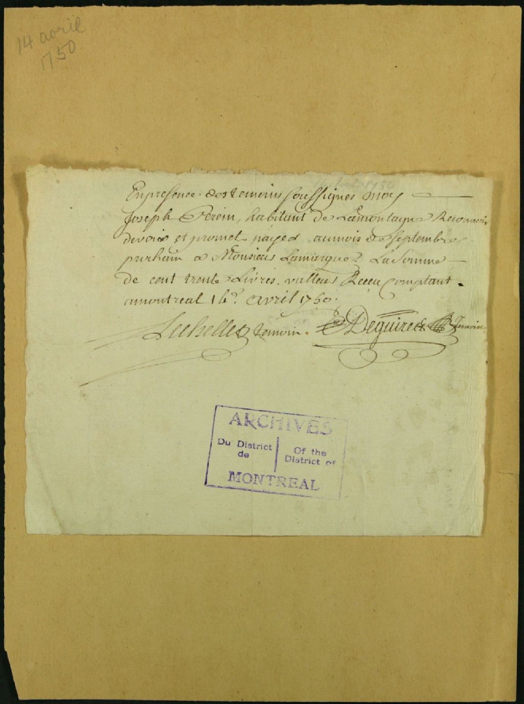 - Ce dossier de matière privée est composé du billet signé par Joseph Perrin, lequel reconnaît devoir et promet de payer, au mois de septembre prochain, à monsieur Nolan [Lamarque?], la somme de 230 livres pour une valeur reçue au comptant. C. Deguire et Léchelle sont les signataires de ce document