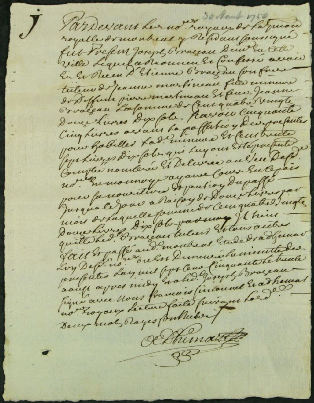 - Ce dossier de matière privée contient une copie d'une quittance notariée de l'étude du notaire Adhémar par laquelle Joseph Brazeau reconnaît avoir reçu de son frère Étienne Brazeau, en sa qualité de tuteur de Jeanne Martineau, fille mineure de Pierre Martineau et de défunte Jeanne Brazeau, la somme de 192 livres et 10 sols pour l'habillement et pension de ladite Jeanne Martineau à raison de 12 livres par mois