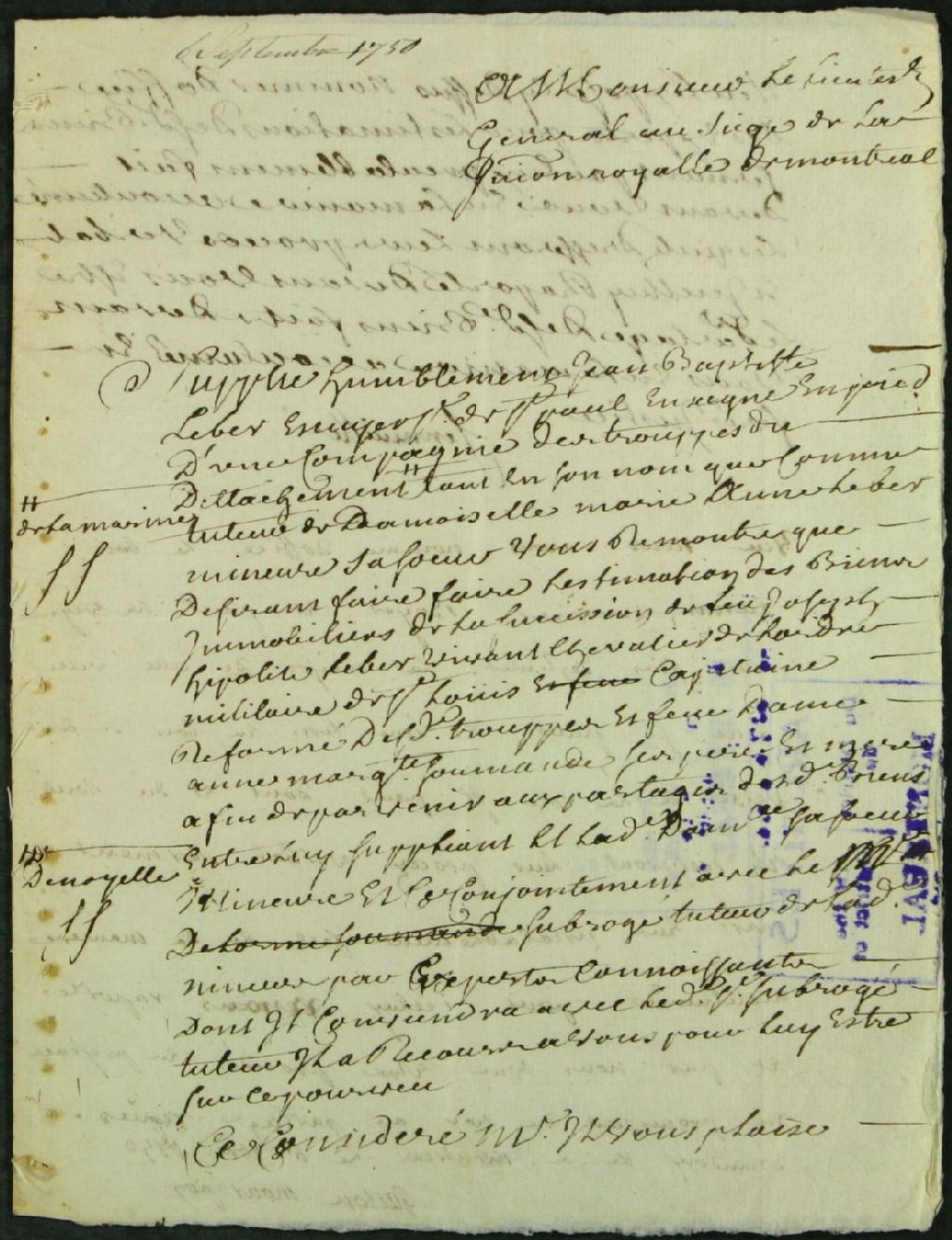 - Ce dossier d'administration judiciaire contient les pièces suivantes : une requête de Jean-Baptiste Leber de Senneville, écuyer, sieur de Saint-Paul, et enseigne en pied d'une compagnie de la marine, en son nom et comme tuteur de sa soeur mineure Anne Leber pour faire l'estimation des biens de la succession de ses parents, Joseph-Hippolyte Leber, capitaine réformé et de feu Marguerite Soumande, afin de parvenir à un partage entre lui et sa soeur ; et la nomination de Caron, Zacharie Boyer et Paul Lavigne afin d'estimer la maison, l'île Saint-Paul et une terre à Côte-Saint-Paul
