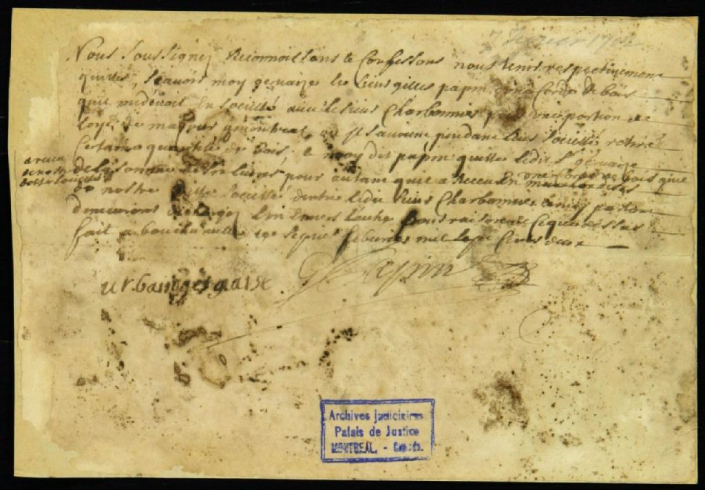 Quittance entre Gilles Papin et Urbain Gervaise pour le paiement d'une partie d'un loyer en échange d'une corde de bois, 7 janvier 1702, Archives nationales à Montréal, Fonds Juridiction royale de Montréal, (06M,TL4,S1,D554).