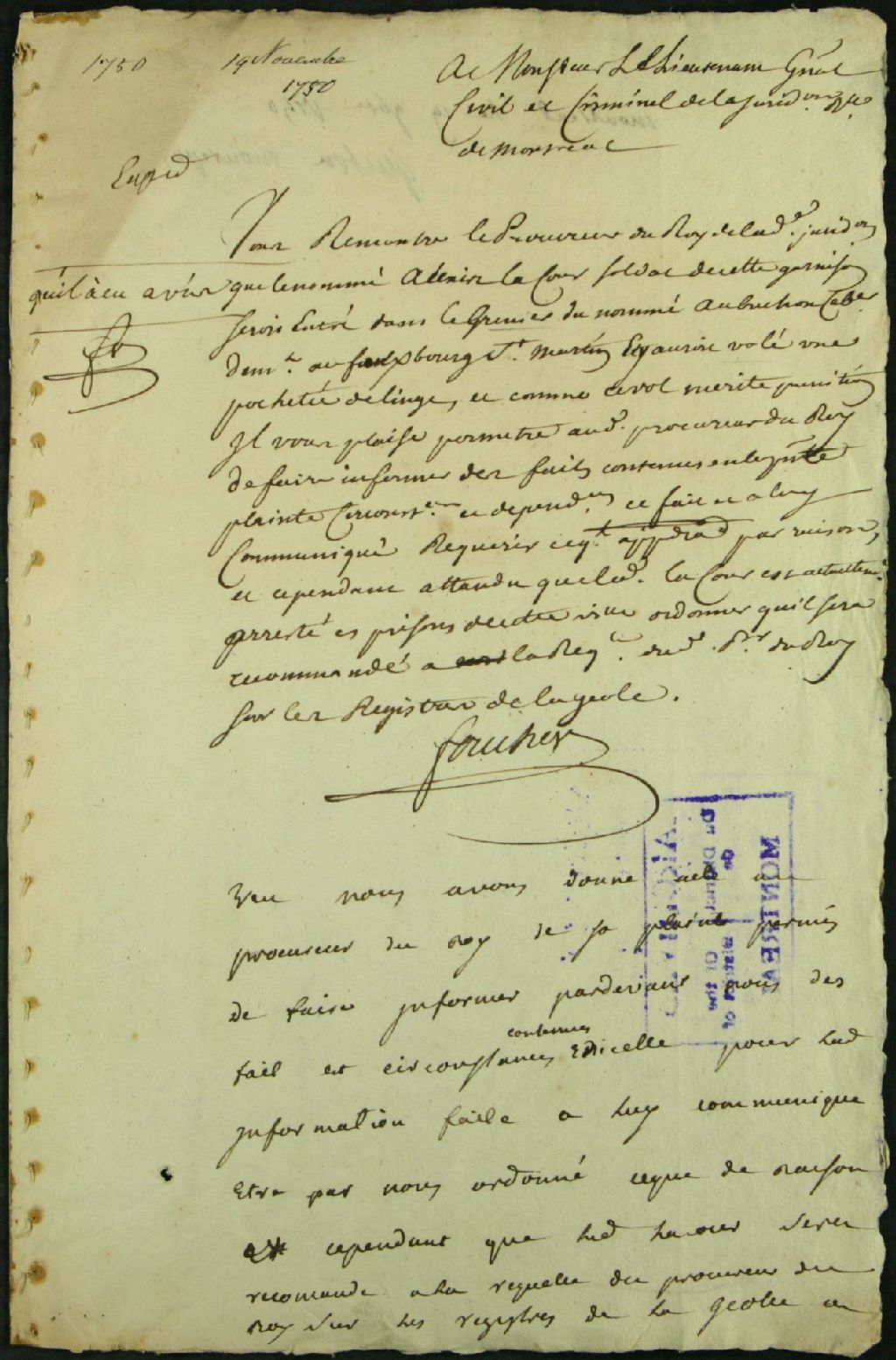 Procès contre Alexis Lacour, soldat de la Compagnie Lépervanche, accusé de vol de linge, 19 novembre 1750 - 9 février 1751, Archives nationales à Montréal, Fonds Juridiction royale de Montréal, (06M,TL4,S1,D5558).