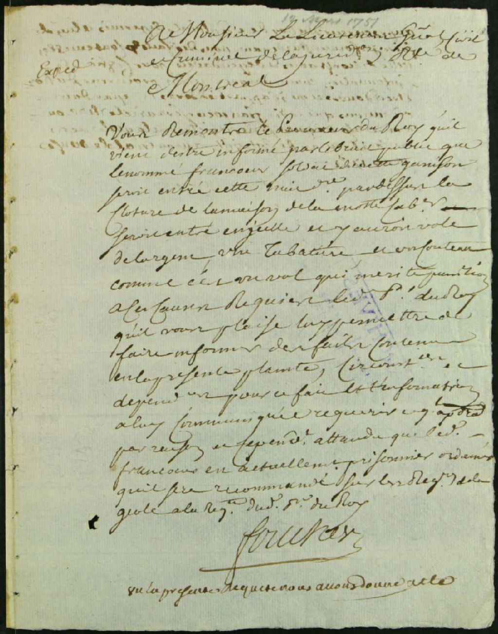 - Ce dossier de matière criminelle est composé des pièces suivantes : la requête pour la tenue d'une information judiciaire au sujet d'un vol perpétré par Jean-Baptiste Henry dit Francoeur, 20 ans, lequel serait entré nuitamment chez l'aubergiste de la rue St-François Pierre Lamothe, 62 ans, époux de Angélique Caron, 44 ans, pour y voler de l'argent, un couteau et une tabatière ; la permission accordé avec ordre d'écrou ; l'interrogatoire de Henry dit Francoeur, en présence de Charles Raymond, capitaine, observateur militaire délégué ; le procès-verbal de la remise par l'huissier Decoste, agissant pour Pierre Lamothe, d'une paire de soulier appartenant à l'accusé, laquelle paire a été trouvée à la porte de l'auberge, ayant été abandonnée lors de la fuite de l'accusé ; l'ordonnance pour faire assigner les témoins du procureur du roi ; le rapport d'assignations ; l'information judiciaire ; la requête pour un décret de prise de corps contre Francoeur ; et la transcription scellée dudit décret.Le dossier contient également : l'extrait des registres de geôles sur l'écrou de l'accusé signé par Pierre Mayer, concierge ; un autre interrogatoire de Henry dit Francoeur avec des aveux complets ; la requête pour le récolement des témoignages ; les ordonnances pour ce faire et assigner les témoins pour les confrontations avec l¿accusé ; les procès-verbaux desdits récolements, dont celui du témoignage de Jacques Branger dit Deslauriers, 29 ans, jardinier, soldat de Noyelles, et des confrontations ; le réquisitoire du procureur du roi pour la conviction de l'accusé et sa condamnation à être fustigé de verges ; l'interrogatoire de l'accusé sur la sellette, en présence de Raymond et des assesseurs Adhémar et J.F. Maillot, lieutenant particulier ; la sentence de conviction du vol pour lequel crime l'accusé est condamné à être pendu et étranglé ; l'appel de sentence par le procureur du roi ; et l'ordre de transférer le prisonnier au palais de Québec