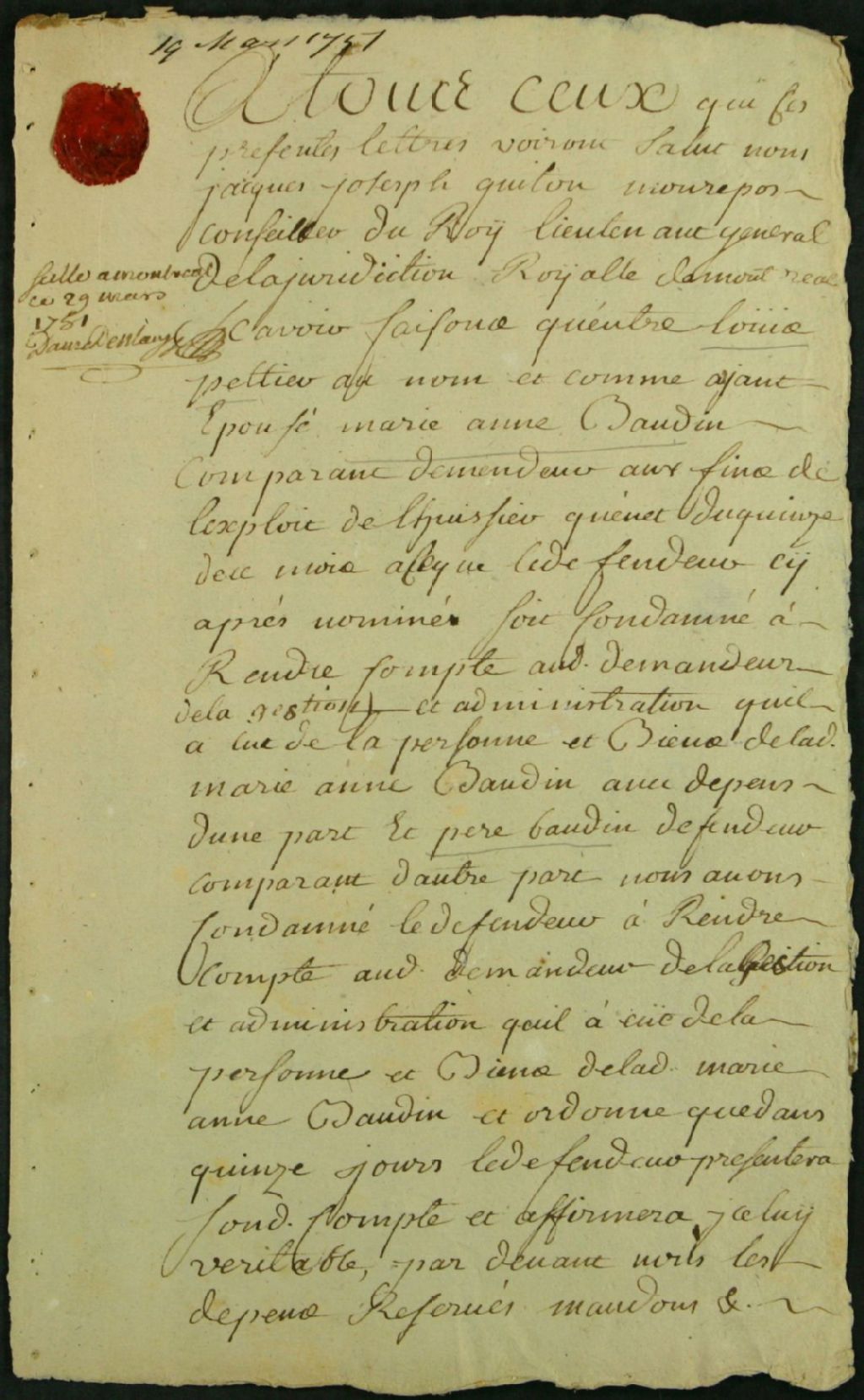Procès entre Louis Pelletier, époux de Marie-Anne Beaudin, demandeur, et son beau-père Pierre Beaudin, défendeur, pour la gestion de biens de ladite Marie-Anne, 19 mars 1751, Archives nationales à Montréal, Fonds Juridiction royale de Montréal, (06M,TL4,S1,D5586).