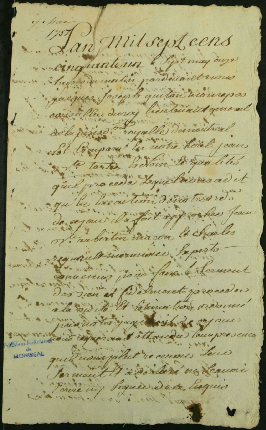 - Ce dossier de matière civile est composé des pièces suivantes : le procès-verbal du serment des experts Jean-Baptiste Aubertin et Charles Renaud, appointés pour faire l'évaluation des propriétés appartenant à Jean Serre, fugitif et à sa défunte épouse, Marguerite Sergent, pour faire suite à une requête en licitation proposée par Jean-Baptiste Tartre, époux de Marguerite Serre, et les autres héritiers, dont Jean-Baptiste Serre ; le rapport des experts sur la valeur des bâtiments estimés à 1500 livres ; la sentence d'ordre et distribution des biens provenant de la vente par licitation des bâtiments de feu Marie-Marguerite Sergent, adjugés à Jean Rousseau dit Saint-Jean pour la somme de 1900 livres, et qui déclare la forclusion acquise contre ledit Jean Serre, absent ; et les quittances par Joseph Serre, fils, de Lachenaie, et par le notaire Bouron au nom de Marguerite Serre