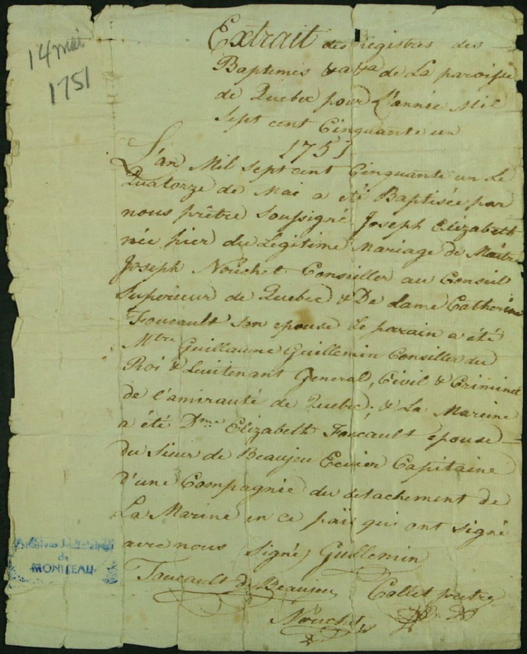 Extrait de baptême de Josèphe Élisabeth Nouchet, 14 mai 1751, Archives nationales à Montréal, Fonds Juridiction royale de Montréal, (06M,TL4,S1,D5601).