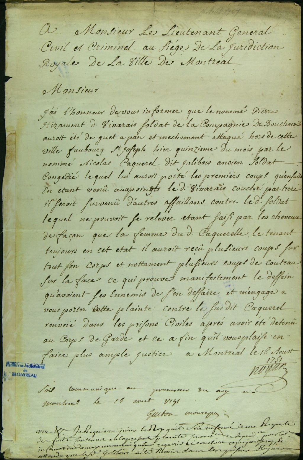 - Ce dossier de matière criminelle est d¿abord composé de la plainte de Payen de Noyan à l'effet que Pierre Hizanet dit Vivarais, soldat de la Compagnie de Boucherville a été attaqué au faubourg Saint-Joseph le 15 de ce mois par le nommé Nicolas Caquerel et sa femme et a reçu plusieurs coups de couteau dans le visage. Il demande la tenue d'une information. Le dossier contient aussi : la communication au procureur du roi, lequel requiert la tenue d'une information ; l'ordre d'informer et de recommander Caquerel sur les registres de la prison ; les requêtes pour faire examiner le blessé par un chirurgien et la décharge de l¿accusé ; l'ordre à Feltz, chirurgien-major, de venir prêter serment et de visiter le blessé ; la sentence qui renvoie Jolibois, absout de l'accusation, ordonne de le relaxer de prison et défend aux parties de se médire et méfaire ; et le rapport du prononcé de la sentence entre les deux guichets de la prison