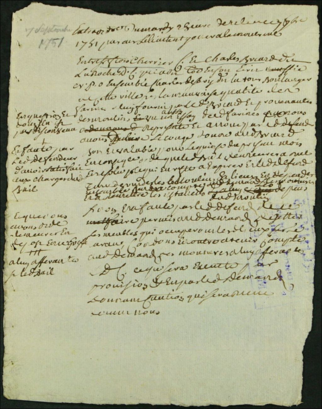 Procès entre François Cherrier, demandeur, et Charles Breillard dit Laroche, défendeur, 7 septembre 1751, Archives nationales à Montréal, Fonds Juridiction royale de Montréal, (06M,TL4,S1,D5637).