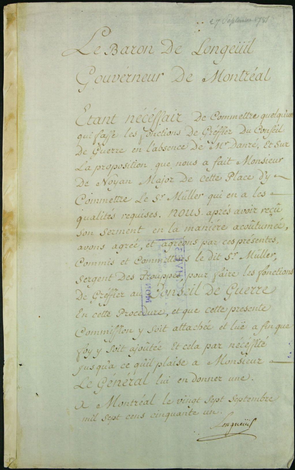Comission pour la nomination de Müller, sergent, comme greffier au Conseil de guerre pendant l'absence de Claude Danré de Blanzy, 27 septembre 1751, Archives nationales à Montréal, Fonds Juridiction royale de Montréal, (06M,TL4,S1,D5643).