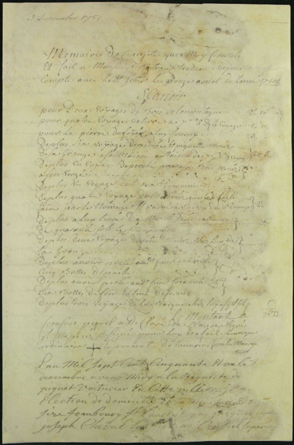 - Ce dossier de matière civile est composé du rapport de signification d'un état de compte pour 36 livres et 17 sols à Bertrand Trudeau à la requête de François Piquet avec assignation à comparaître