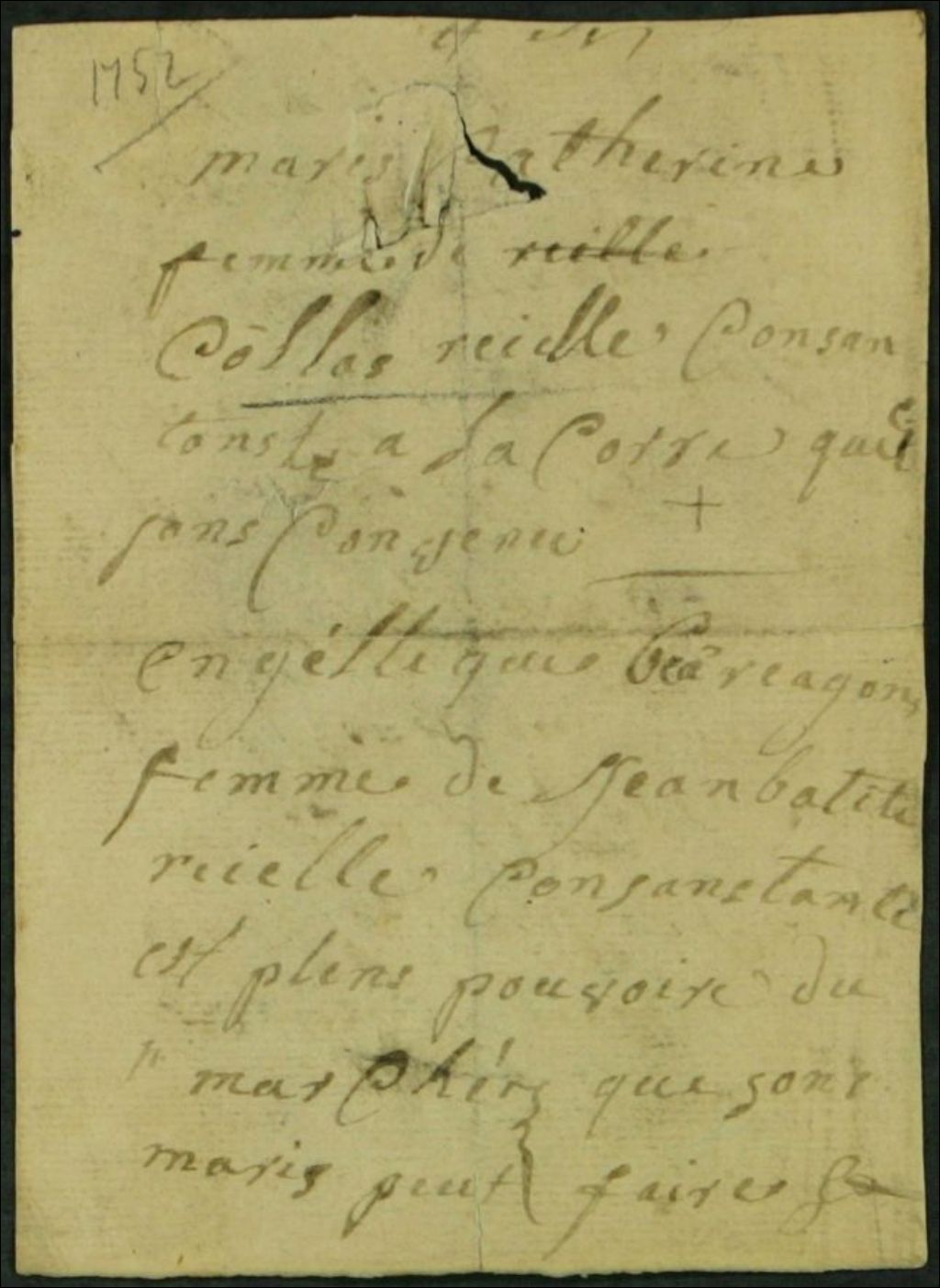 Consentement à un accord par Marie-Catherine [Haguenier?], épouse de Nicolas Riel, et Angélique [Baillargeon?], épouse de Jean-Baptiste Riel, [Après 1764?], Archives nationales à Montréal, Fonds Juridiction royale de Montréal, (06M,TL4,S1,D5663).