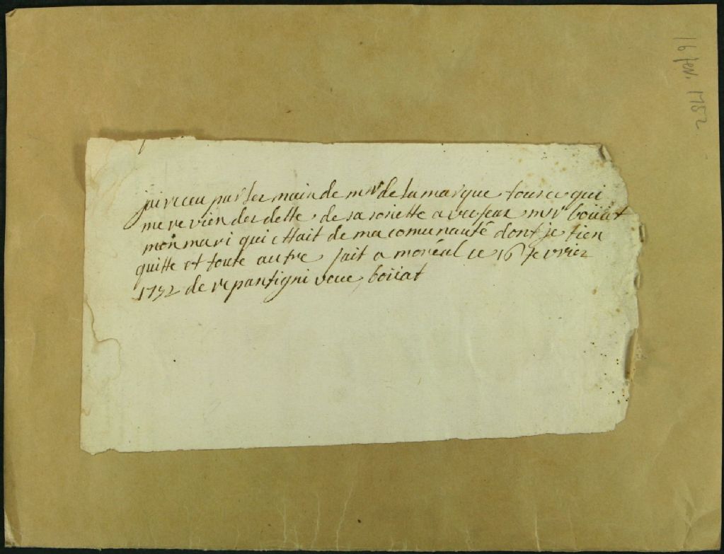 Quittance de Agathe Legardeur de Repentigny, veuve de Bouat, à Charles Nolan Lamarque et état de compte de ce dernier avec Bouat, 16 février 1752 - 14 décembre 1753, Archives nationales à Montréal, Fonds Juridiction royale de Montréal, (06M,TL4,S1,D5674).