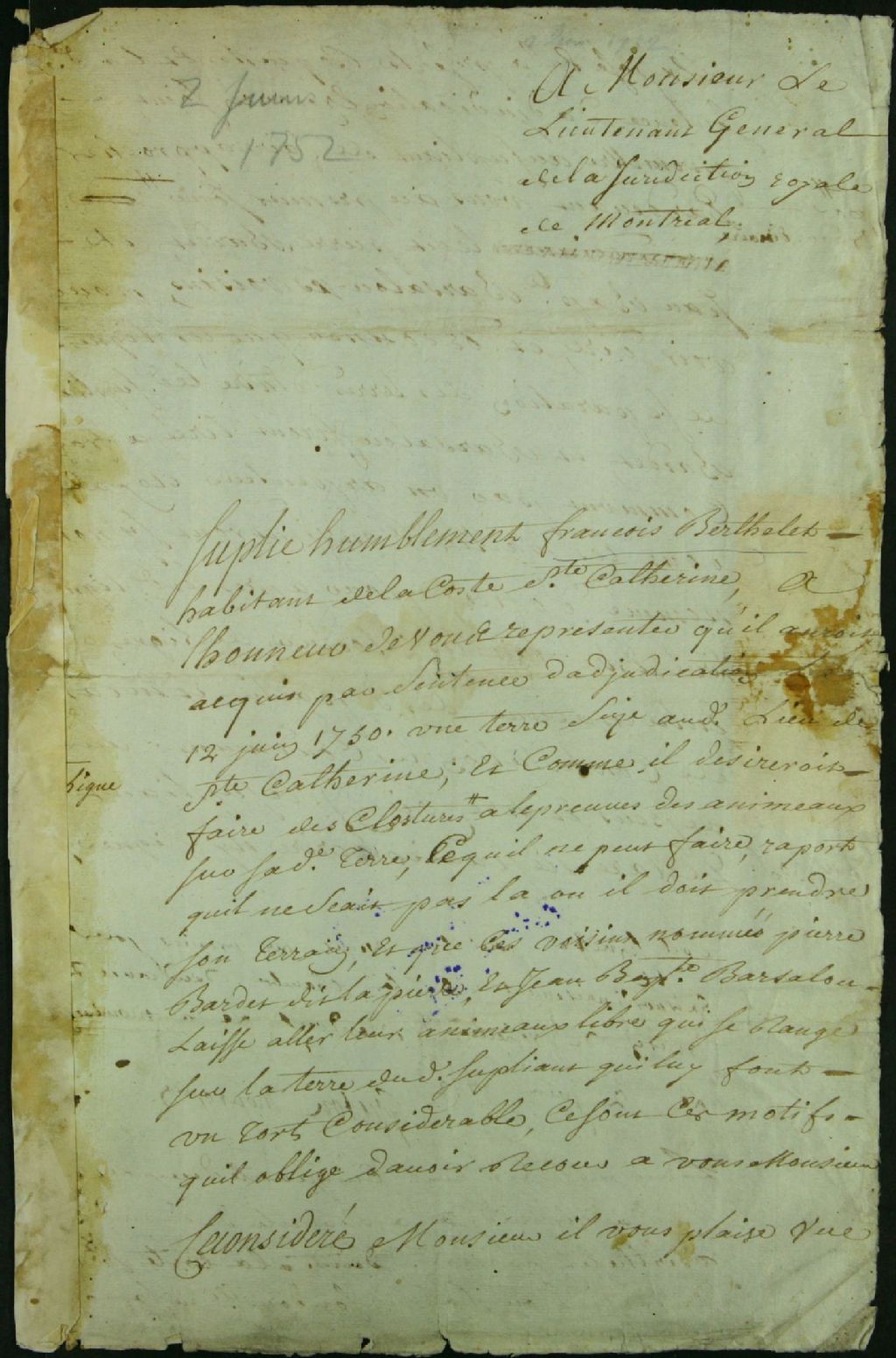 - Procès entre François Berthelet, habitant de Côte-Sainte-Catherine, demandeur, et Jean-Baptiste Barsalou, tanneur, et Pierre Bardet dit Lapierre, défendeurs, pour l'installation de clôtures, tirage de lignes et restitution de bois