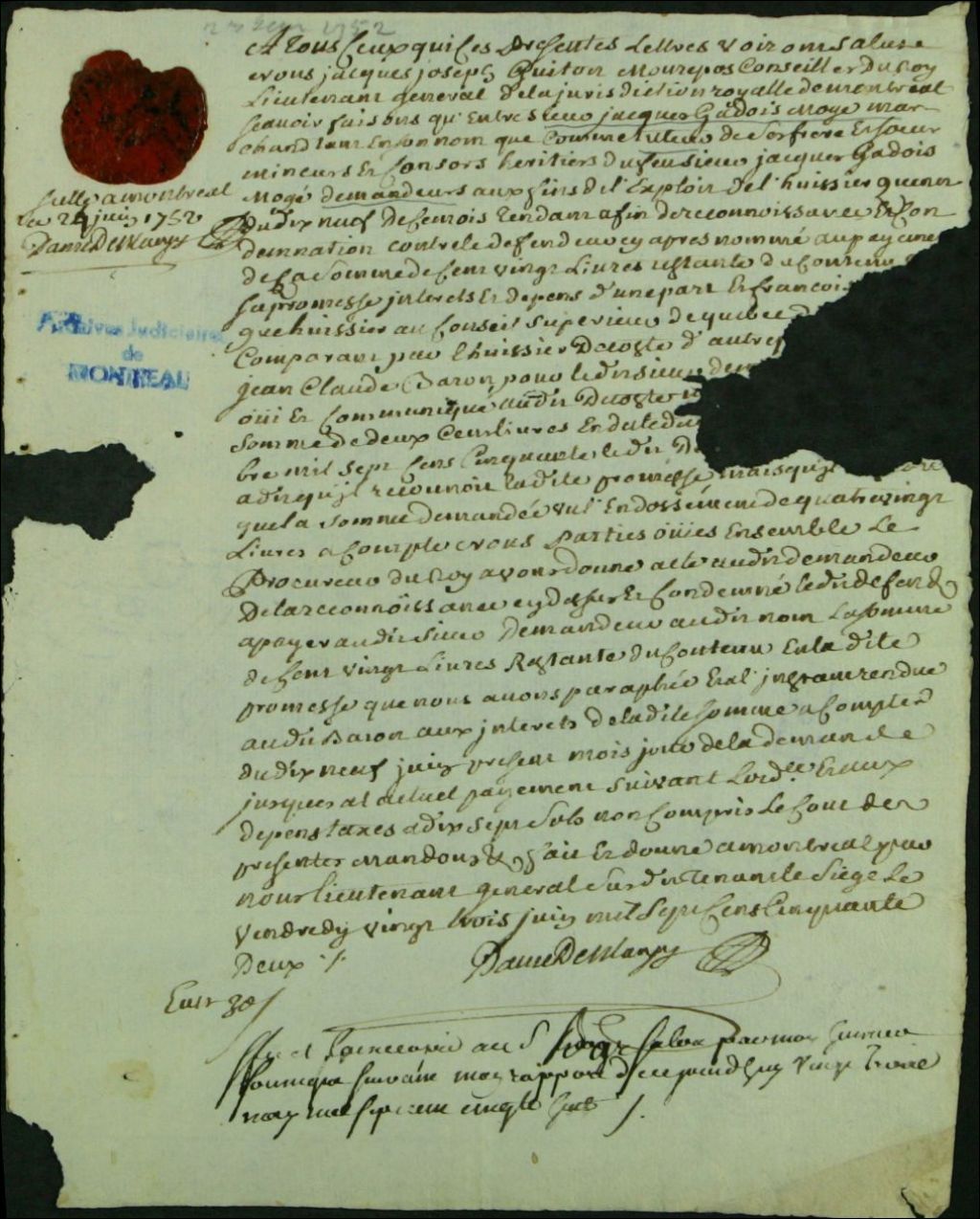 - Procès entre la succession Jacques Gadois dit Mauger, demanderesse, et François Dumergue, huissier au Conseil Supérieur, défendeur, pour payement de billet et obligation