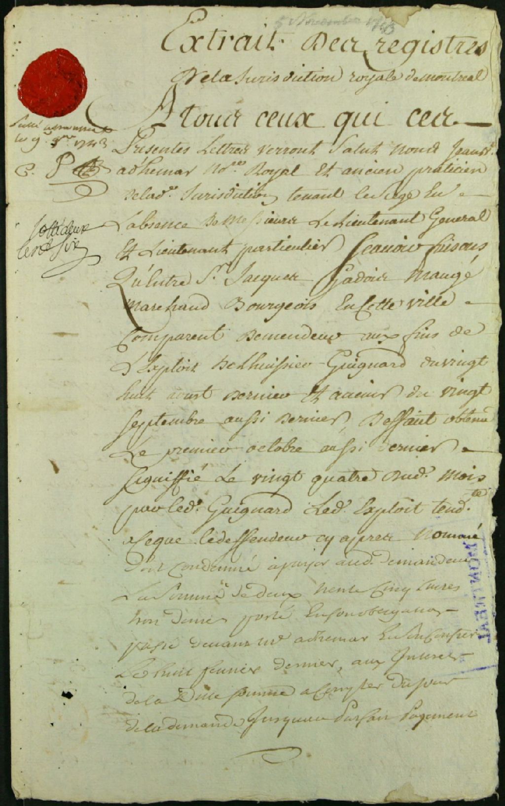 - Procès entre Jacques Gadois dit Mauger, fils, négociant à Varennes, demandeur, et Antoine Poineau, habitant de Châteauguay, défendeur, pour le payement d'une obligation