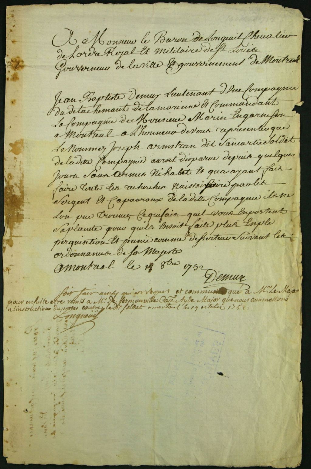 - Ce dossier de matière criminelle est composé des pièces suivantes : la requête adressée à Lemoine de Longueuil, gouverneur, par Jean-Baptiste de Muy, lieutenant et commandant la Compagnie de Marin, en garnison dans cette ville, pour initier plus amples recherches pour retrouver Joseph Armstrong, disparu depuis quelques jours et présumé avoir déserté ; la permission ; les ordres à Michon et Flame, sergents, d'aller à la poursuite du déserteur : le signalement de l'accusé : anglais, parlant mal le français ; les rapports de Flame et Michon sur les recherches faites pour trouver le déserteur ; le réquisitoire de Payen de Noyan, commis procureur du roi au Conseil de guerre, pour tenir un procès ; la permission de tenir une information sous la direction de Christophe Sabrevois de Sermonville, aide-major ; l'information ; le procès-verbal du récolement des témoignages ; les conclusions du procureur du roi commis ; la sentence du Conseil de guerre qui déclare la contumace bien instruite et trouve Joseph Armstrong atteint et convaincu de désertion, pour lequel crime il sera passé par les armes ; et le rapport de publication à la tête des troupes. Edmond Michon dit Michon, 26 ans, sergent de la Compagnie Marin, et Louis Larue dit Saint-Louis, Caporal de la même compagnie, sont les témoins de cette affaire. De Lacorne, l'aîné, et de Lacorne, chevalier, sont en outre nommés comme membre du Conseil dans ces documents