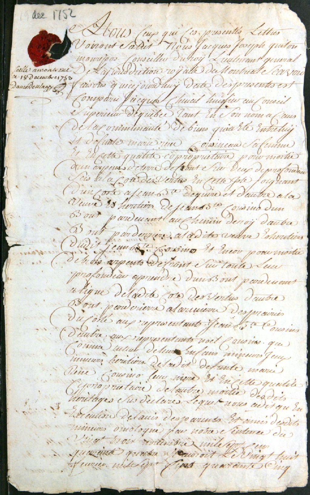 - Ce dossier d'administration judiciaire est composé des pièces suivantes : la transcription scellée d'une sentence d'adjudication à Pierre Blain, de terres situées à Côte-des-Vertus, appartenant à Jacques Cheval et à sa défunte femme, Marie-Reine Cousineau, suite à une vente par licitation ; la quittance par le prêtre Montgolfier, pour les cens et rentes et lods et ventes ; et la quittance notariée par Catherine Hay, veuve de Jean-Baptiste Cousineau, créancière de Jacques Cheval, laquelle dit avoir reçu de Pierre Blain, 603 livres 10 sols et 5 deniers, suivant la sentence du 1 décembre 1752