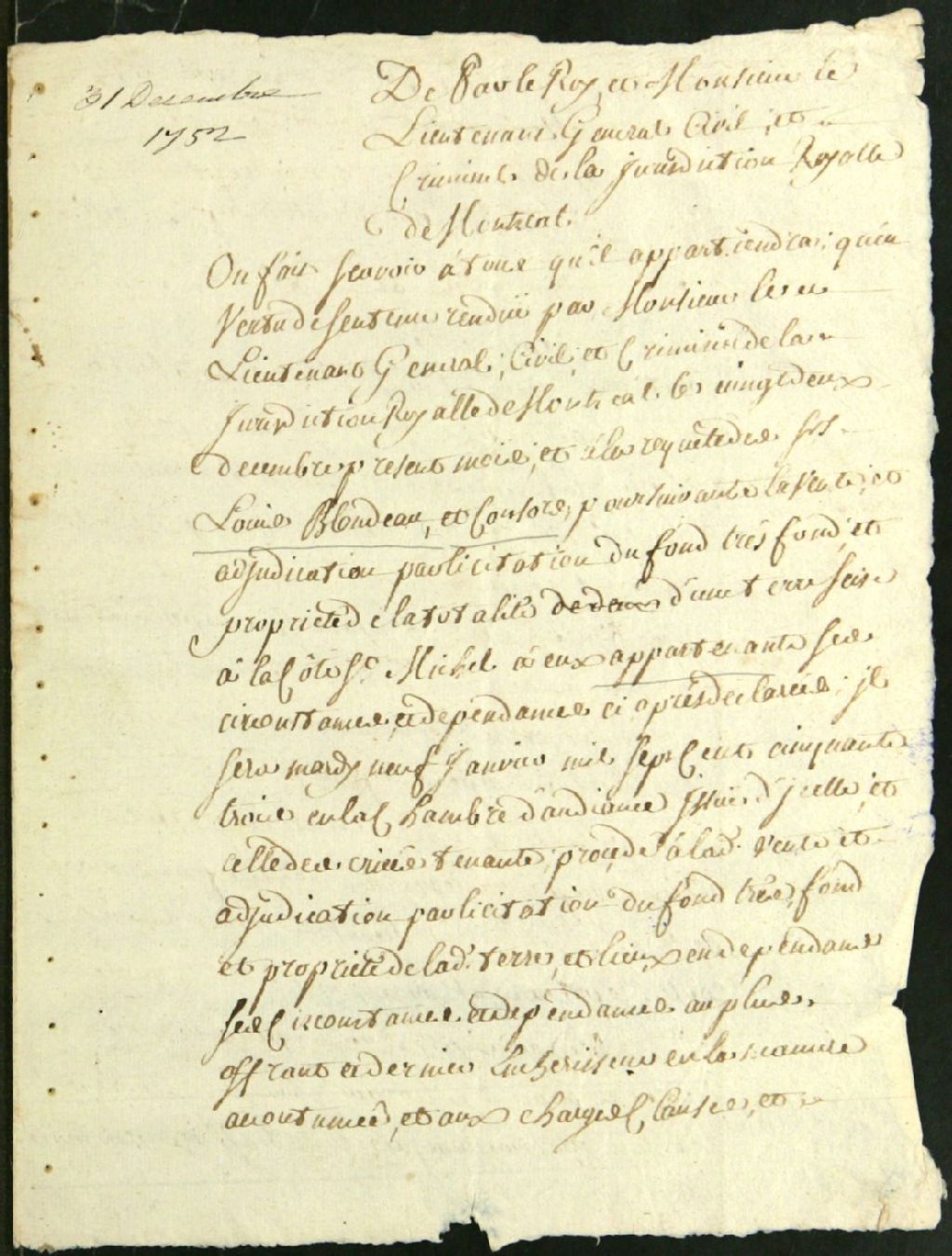 Licitation d'une terre située à la côte Saint-Michel à la requête de Louis Blondeau et consorts