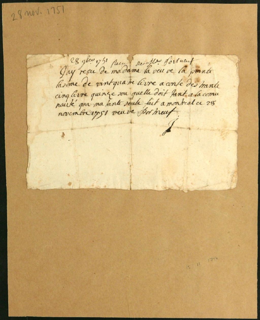 - Ce dossier de matière civile est composé des pièces suivantes : la requête de Angélique Dupré pour faire approcher ses enfants et gendres pour lui rembourser solidairement ce qu'elle a déboursé pour les funérailles de son époux, son habit de deuil, les frais du chirurgien, les 150 messes qu'elle a fait dire pour la mémoire de son défunt mari et les 200 livres de préciput ; la permission ; les assignations à comparaître ; la transcription d'une sentence d'appointement qui ordonne la présentation des pièces en cour ; le contredit par Angélique Dupré contre les défendeurs ; les rapports de sommation et de l¿interpellation aux défendeurs de soumettre les pièces dont ils veulent se servir ; les inventaires des pièces produites par Angélique Dupré et par Viau, François Quintal et Charles Racicot ; la signification à parties ; les sommations ; le certificat de Carmel Levasseur à l'effet qu'il a prêté l'argent à la veuve Robin pour payer le service de son mari ; le mémoire de ce que la veuve Lapointe a fourni pour les funérailles de son mari ; et le certificat de Antoine Robert au sujet d'une dette de la succession envers Pierre Bergeron. Le dossier contient finalement plusieurs quittances : pour 19 livres pour l'enterrement de Robin ; au prêtre Morand pour le service ; à Durseau ; au notaire Loiseau ; à la veuve Portneuf ; et par François Gareau aux des défendeurs Racicot, Viau et Quintal