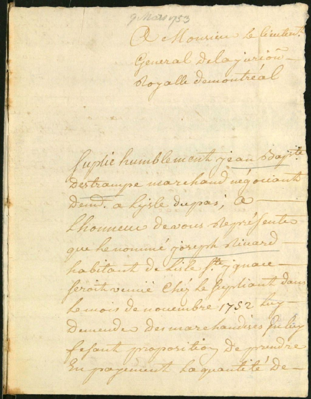 Procès entre Jean-Baptiste Destrampes, négociant de l'île Dupas, demandeur, et Joseph Rivard, habitant de l'île Saint-Ignace, défendeur, pour la livraison de tabac, 9 mars 1753 - 14 mars 1753, Archives nationales à Montréal, Fonds Juridiction royale de Montréal, (06M,TL4,S1,D5769).