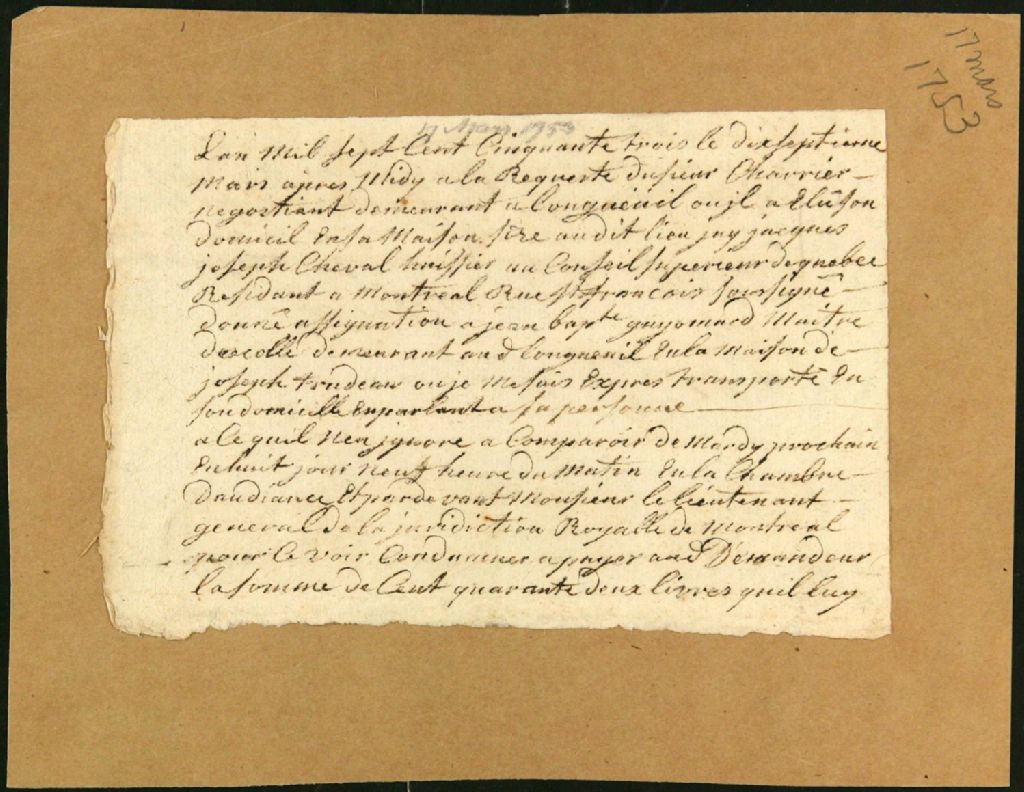- Ce dossier de matière civile est composé des pièces suivantes : le rapport de signification d'un compte arrêté de 142 livres pour argent prêté pour les frais associés au passage de la France à Montréal de Jean-Baptiste [Guyomard?] à la requête de F. Cherrier ; et le compte arrêté pour les frais du passage de Guyomard depuis LaRochelle jusqu'à Montréal